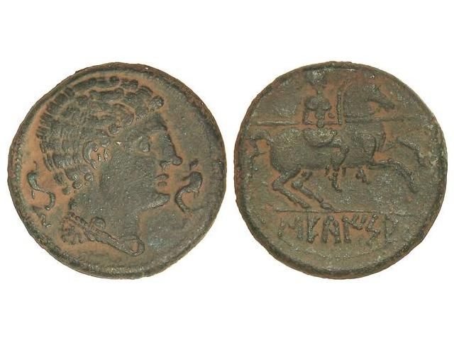 As. SECAISA. Anv.: Cabeza masculina a derecha rodeada por dos delfines. Rev.: Jinete con lanza a derecha, debajo leyenda ibérica. 9 grs. Pátina verde. AB-2131. EBC-/MBC+.