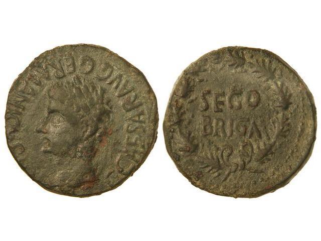 As. SEGOBRIGA. Anv.: Cabeza laureada de Calígula a izquierda. Rev.: Láurea, dentro SEGOBRIGA. 18,50 grs. CU. Pátina verde. AB-2191. EBC-.
