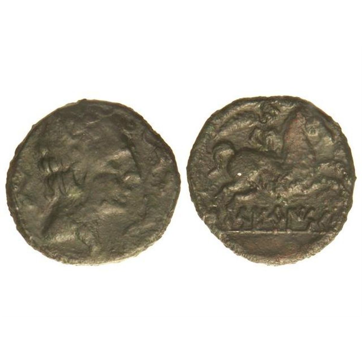 As. - SETEISCEN. - Anv.: Cabeza a derecha, rodeada de tres delfines. Rev.: Jinete con palma a derecha, debajo leyenda ibérica. 7,66 grs. Pátina oscura. AB-2206. MBC. - -