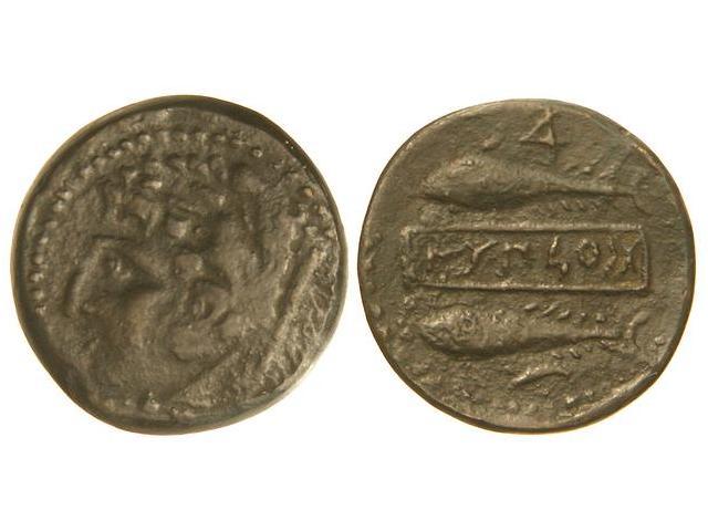 As. SEXI. Anv.: Cabeza de Melkart con piel de león a izquierda, detrás clava. Rev.: Dos atunes a izquierda, encima letra púnica alef, en medio cartela con leyenda púnica y debajo letra púnica. 9,50 grs. Pátina negra. AB-2229 sim. MBC.