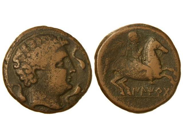 As Uncial. ILTIRTA. Anv.: Cabeza masculina a derecha, rodeada de tres delfines. Rev.: Jinete con palma y clámide, debajo leyenda ibérica. 27,90 grs. MUY ESCASA. AB-1461. MBC-.