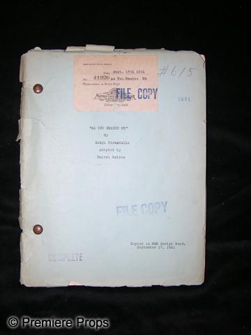 As You Desire Me (1932) - An original script of the play to be used in adaptation of screenplay for film starring Greta Garbo, Melvyn Douglas, Erich von Stroheim and Hedda Hopper. This is an MGM file copy with various labels from the MGM script department. Draft dated 9/17/31 by Luigi Pirandello, adapted by Dimitri Ostrov. Stamped "File Copy" and numbered.