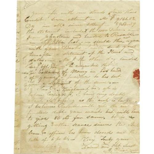 <B>Asa Brigham Autograph Letter Signed "</B></I><B><I>A. Brigham</B></I></B></I><B>."</B></I> 3 pages, 7.75 x 9.75", Austin, January 8, 1840 to Robert Mills. Brigham (c.1790-1844), the first Treasurer of the Republic of Texas, writes to Mills (1809-88) a prominent merchant, concerning a counterfeiter. In part: "<I>...In the package you sent by Mr. Perry of $800 I return you one 50$ bill counterfeit, I did not discover it until the 2 auditor returned it to me defaced as you find it. In the package sent by J.R. Jones of $1,371 I find $40 counterfeit... These bills are well calculated to deceive persons as the signature of H. Smith is genuine, the bills of that no. should have been dated the 15th of Nov. 1838. W.G. Cook denys (sic) the signature of Sam Houston to be his writing and Major Izod says he did not no. or date them. You will see all the figures 8 in the genuine bills are made very different from those of the counterfeit notes - and the signature of Sam Houston on the bad notes is badly executed...</B></I>" <BR><BR>Asa Brigham (c. 1790-1844) was signer of the Texas Declaration of Independence, the first treasurer of the Republic of Texas, and mayor of Austin. Brigham emigrated from Louisiana to Texas in April 1830. In December the ayuntamiento of San Felipe de Austin announced his election as sindico procurador for the precinct of Victoria (Brazoria), and in December 1831 he was elected comisario for the same precinct. He was one of those who signed a document on June 20, 1832, indicating readiness to participate in military operations in the interest of Texas independence. After 1832 he kept a ferry at Brazoria, where he ran a mercantile business with his son-in-law, and later he was a stockholder in the San Saba Colonization Company and receiver of stock for the Brazos and Galveston Railroad. He acquired leagues of land at Hall's Bayou in Brazoria County and in Galveston and Bastrop counties, and raised sugar, cotton, corn, and cattle. Brigham was elected Brazoria alcalde in 1835. He served as one of four representatives from Brazoria to the Convention of 1836 at Washington-on-the-Brazos and was a signer of the Texas Declaration of Independence. He remained at the convention until at least March 16, 1836. David G. Burnet appointed him auditor of the Republic of Texas, and President Sam Houston named him Treasurer on December 20, 1836. He was the first to hold the latter office and was reappointed by Mirabeau B. Lamar in January 1839. On February 16, 1839, Brigham became a Houston alderman while serving as national treasurer. He left the treasury on April 12, 1840; later that year he was charged with using state funds for private purposes but was cleared. Houston reappointed him Treasurer on December 31, 1841, and in 1842 Brigham became mayor of Austin. <BR><BR>With integral address leaf bearing much of wax seal. Usual folds, soiled with some fading, interior pages cleaner and overall quite legible, overall good condition. Asa Brigham examples with any content are quite difficult. <I>From the collection of Darrel Brown.</B></I><BR><BR><b>Shipping:</b> Flat Material, Small (<a target="_blank" href="http://www.heritageauctions.com/common/shipping.php">view shipping information</a>)<BR><BR><B>Important notice: