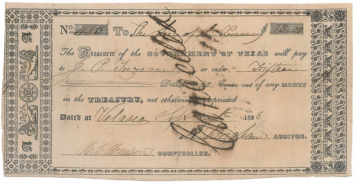 Signer of the Texas Declaration of Independence, first treasurer of the Republic of Texas, and mayor of Austin (1790–1844). Partly-printed DS, signed “A. Brigham,” one page, 6.5 x 3.25, September 4, 1836. Pay order, in part: “The Treasurer of the Government of Texas will pay to J. P. Trezevant or order, Fifteen Dollars.” Expected document wear and bold cancellation notations affecting much of Brigham’s signature, otherwise fine condition. Provenance: The Robert Davis Collection.