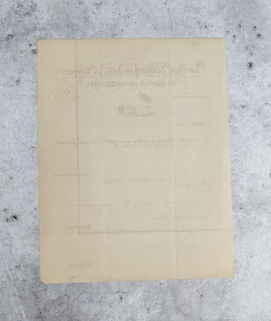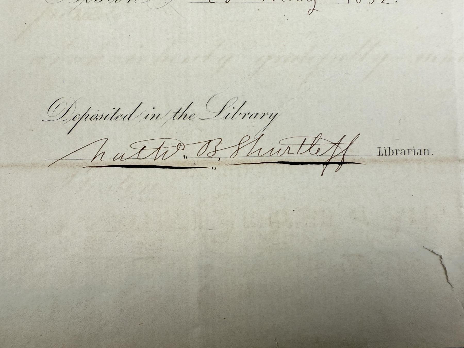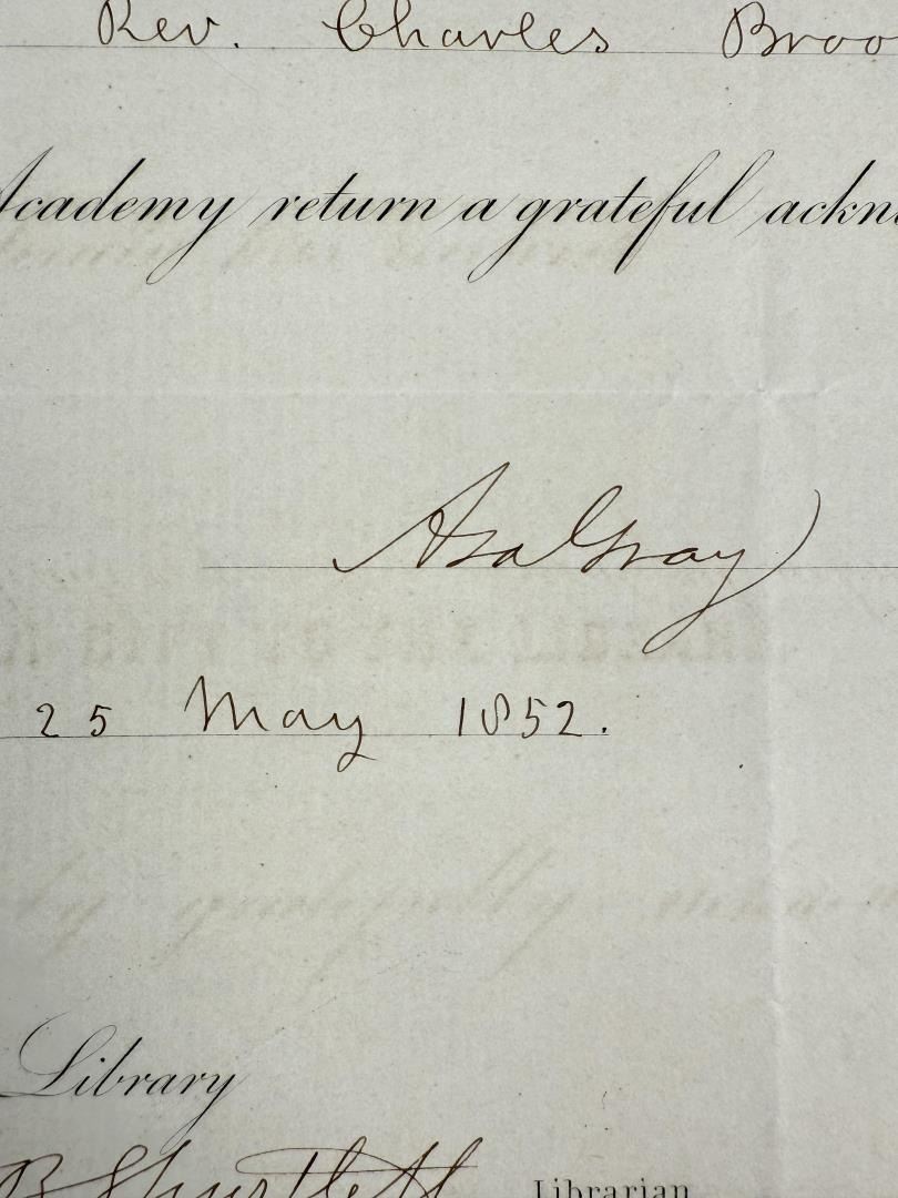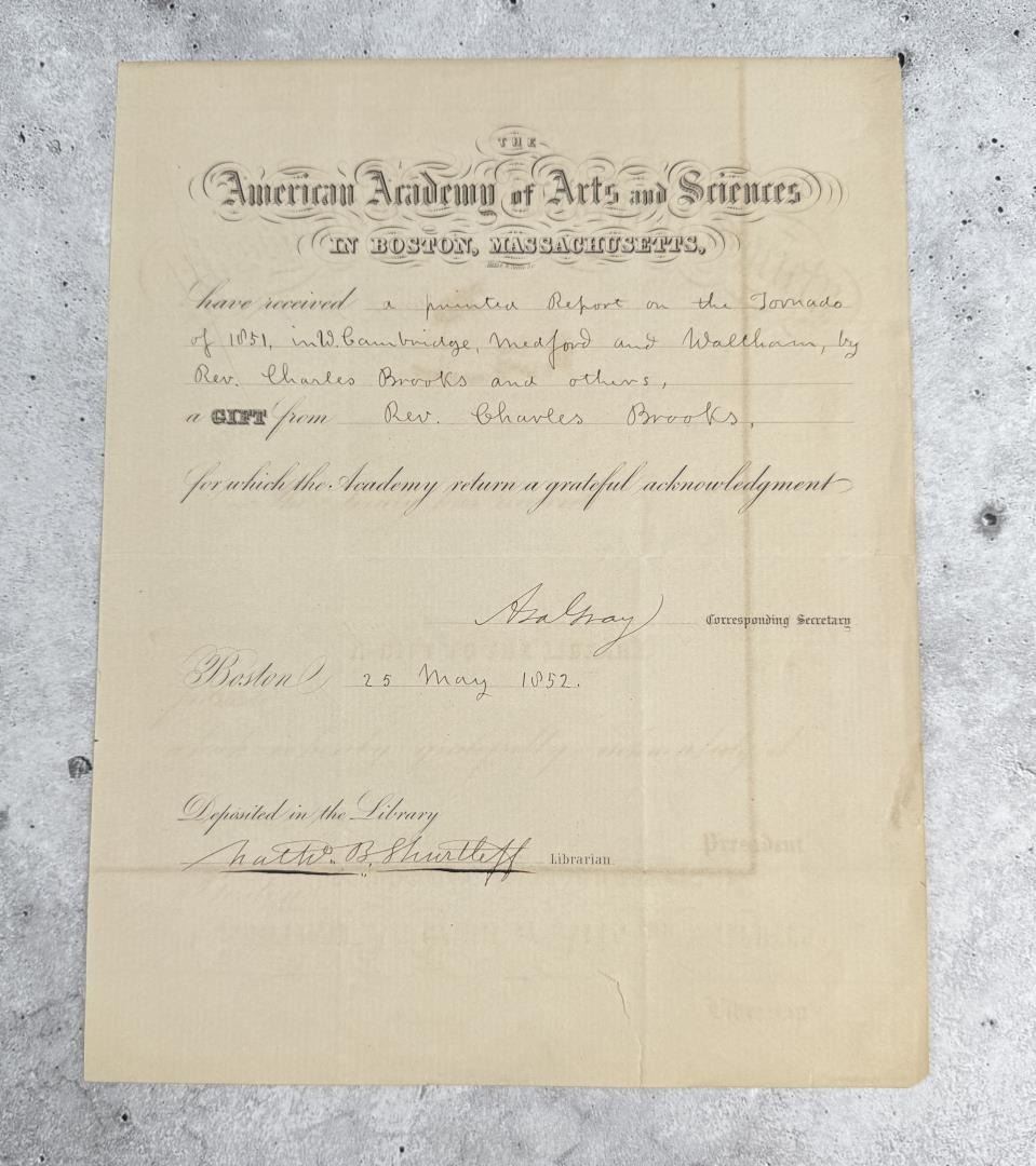 The American Academy of Arts and Sciences in Boston Massachusetts signed award letter in regards to the gift of a Printed Report on the Tornado of 1851 by Charles Brooks. Signed by Charles Brooks and Asa Gray. Asa Gray (November 18, 1810 – January 30, 1888) is considered the most important American botanist of the 19th century. His Darwiniana (1876) was considered an important explanation of how religion and science were not necessarily mutually exclusive. Gray was adamant that a genetic connection must exist between all members of a species. He was also strongly opposed to the ideas of hybridization within one generation and special creation in the sense of its not allowing for evolution. He was a strong supporter of Darwin, although Gray's theistic evolution was guided by a Creator. As a professor of botany at Harvard University for several decades, Gray regularly visited, and corresponded with, many of the leading natural scientists of the era, including Charles Darwin, who held great regard for him. Gray made several trips to Europe to collaborate with leading European scientists of the era, as well as trips to the southern and western United States. He also built an extensive network of specimen collectors. A prolific writer, he was instrumental in unifying the taxonomic knowledge of the plants of North America. Of Gray's many works on botany, the most popular was his Manual of the Botany of the Northern United States, from New England to Wisconsin and South to Ohio and Pennsylvania Inclusive, known today simply as Gray's Manual. Gray was the sole author of the first five editions of the book and co-author of the sixth, with botanical illustrations by Isaac Sprague. Further editions have been published, and it remains a standard in the field. Gray also worked extensively on a phenomenon that is now called the "Asa Gray disjunction", namely, the surprising morphological similarities between many eastern Asian and eastern North American plants. Several structures, geographic features, and plants have been named after Gray. In 1848, Gray was elected as a member of the American Philosophical Society.