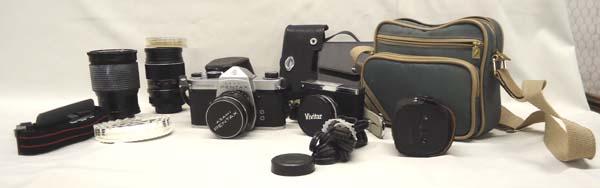 Asahi Pentax Spotmatic SLR 35 mm Camera Plus. F1.4 50 mm Asahi Super-Takumar lens, manual and automatic plus polarizing. UV filters. F3.5-4.5 28-80 mm Kotaishi zoom lens with a haze filter. Vivitar F2.8 135 mm lens. Vivitar Auto 2X Tele-Converter (doubler). Vivitar electronic flash and flash bar. Leather camera case. SHI $25.