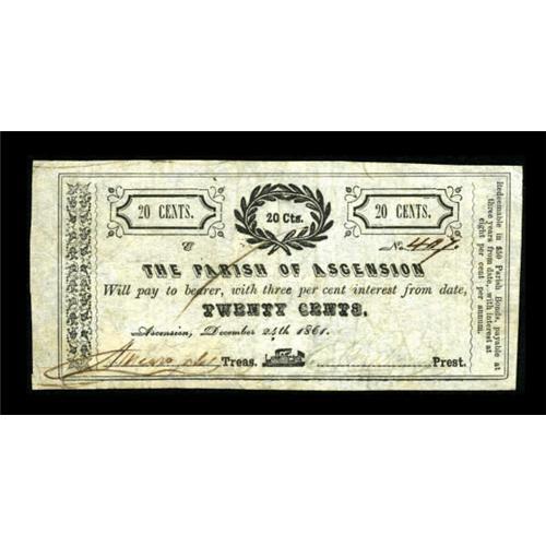 <B>Ascension, LA- Parish of Ascension </B></I>20¢ Dec. 24, 1861 <BR> The first of three notes from this rare Parish, located between Baton Rouge and New Orleans. This is a denomination we have never previously encountered from here, and a note which, if not unique, is one of a mere handful of survivors, as it was missing from both the Smythe 1991 Parish collection sale as well as the Rareshide offering in 2005. <B>Very Fine. </B></I><BR><I>From The Collection of a Louisiana Gentleman.</B></I><BR><BR><b>Shipping:</b> Coins & Currency (<a target="_blank" href="http://www.heritageauctions.com/common/shipping.php">view shipping information</a>)