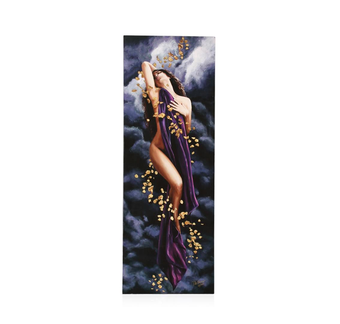 Ascension: In all her purple glory, a beautiful Goddess ascends to her throne in the Heavens above, surrounded by a shower of golden feathers. What awaits her there? This is a limited edition giclee on canvas stretched and gallery-wrapped, ready for hanging with or without molding. Chris DELLORCO is a well known Disney artist. Limited Edition S/N Giclee on Canvas # 21/195.