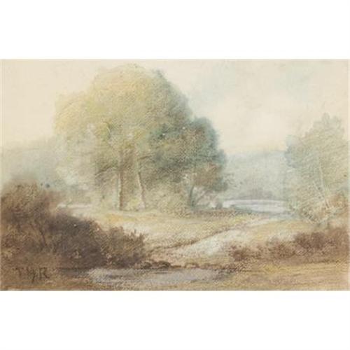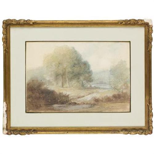 <B>Ascribed to THEODORE ROUSSEAU (French, 1812-1867)</B></I><BR><I>Dans la Foret de Barbizon</B></I>, circa 1864<BR>Pastel and watercolor on paper<BR>12 x 17 inches (30.5 x 43.2 cm)<BR>Initialed lower left: <I>T.H.R.</B></I><BR> <BR>PROVENANCE:<BR>B. Sonnenberg, New York, New York;<BR>Madison Avenue Gallery, New York, New York<BR><BR>EXHIBITED:<BR>The Museum of Modern Art, Hyogo, Japan, "The Rediscovery of Nature, An Anthology of 19th Century Landscape Painting in the West," 1983-84 (Traveled to Iwate, Saitama, Hiroshima, Kitakyushu). <BR><B>Condition Report:</B> Not examined outside of frame.<BR><BR><b>Shipping:</b> Framed - with Glass, Medium (<a target="_blank" href="http://www.heritageauctions.com/common/shipping.php">view shipping information</a>)