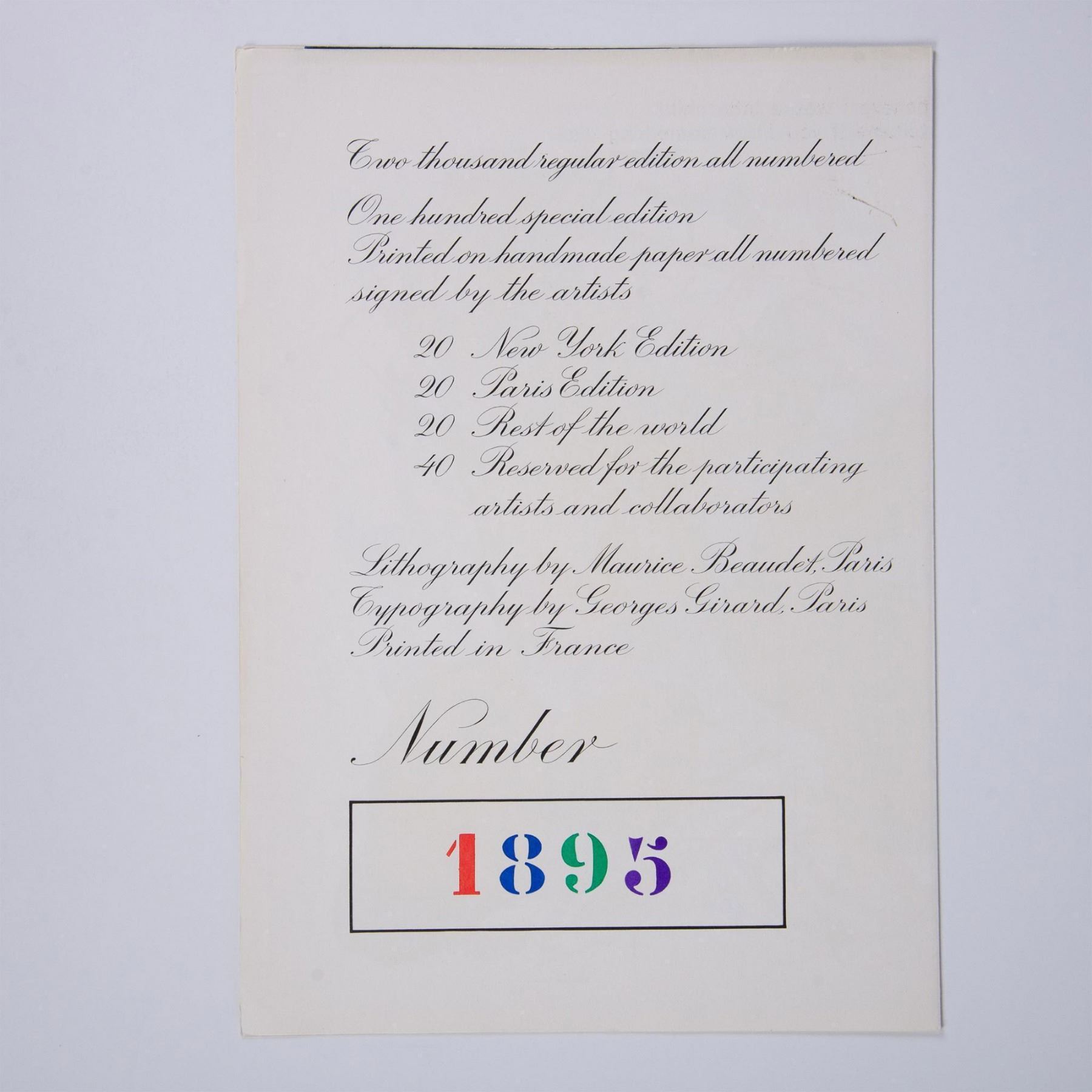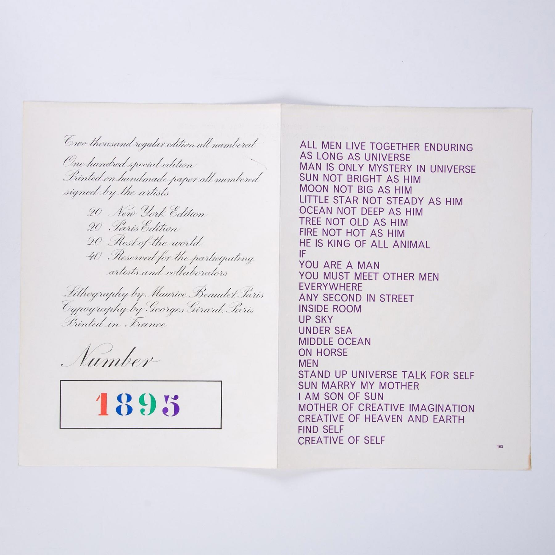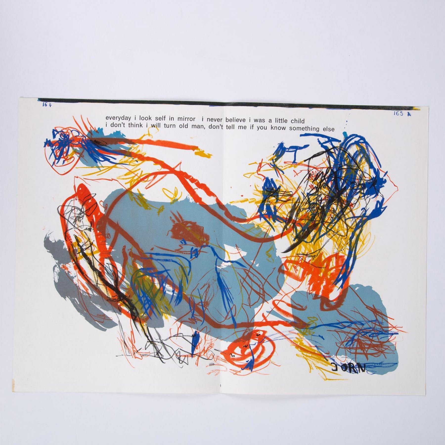 A two-page spread original lithograph on BFK Rives paper by artist Asger Jorn accompanied with poems on both sides by Walasse Ting. Pulled from renowned Pop Art masterpiece portfolio by Ting, One Cent Life. Lithography was printed in Paris by Maurice Beaudet and the typography carried out in handset letterpress by George Girard. The book was published by E. W. Kornfeld, Bern, Switzerland in 1964, and edited by artist Sam Francis. Artists signature in plate on lower right side: Jorn. 1895 from a rare limited edition of 2000. Printed edition number 1895 on verso.