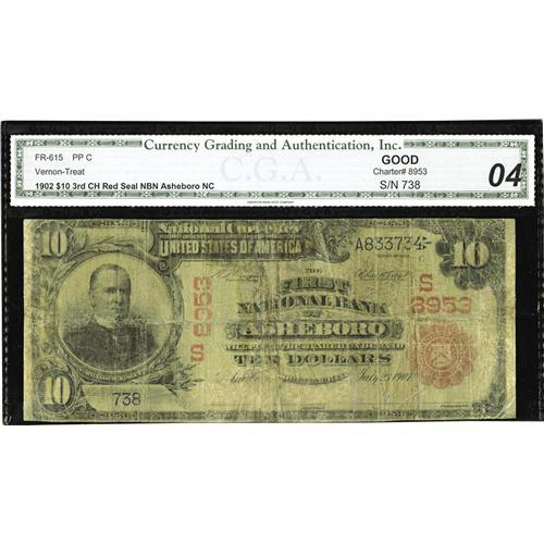 <B>Asheboro, NC</B></I> - $10 1902 Red Seal Fr. 615 <B>The First NB </B></I> Ch. # (S)8953<BR>The Red Seal issue is quite scarce for the state with less than 20 known notes. What this note lacks in grade is most certainly made up for in rarity. Graded <B>Good 4</B></I> by CGA.