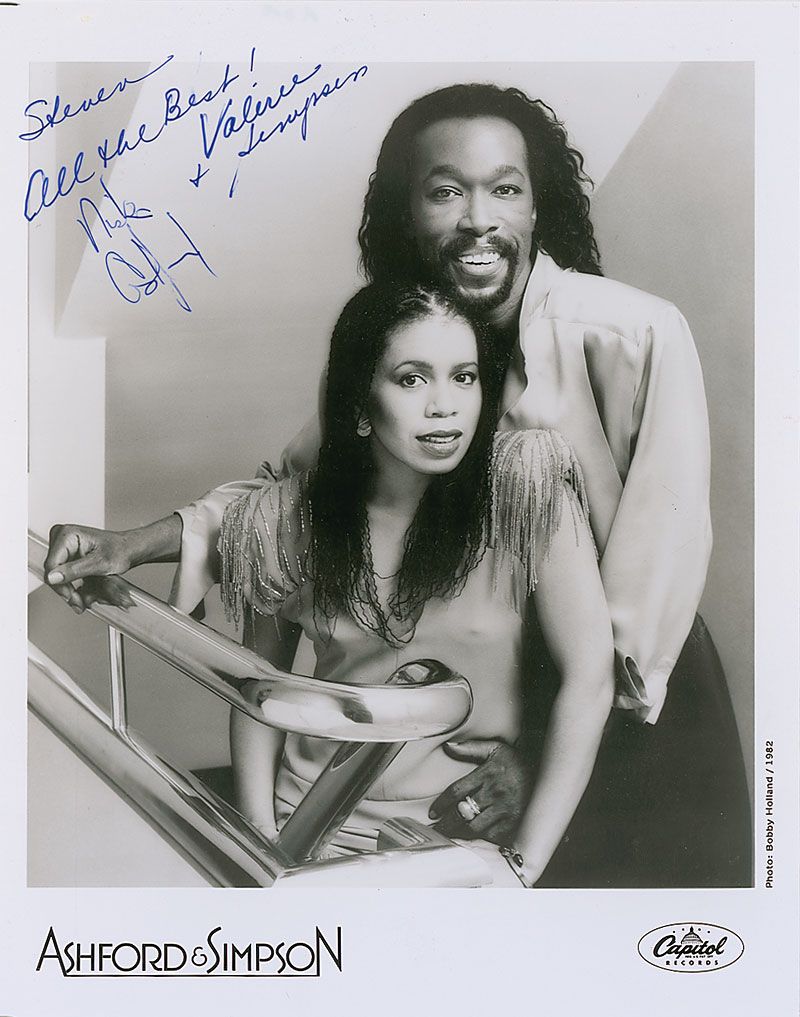 Glossy 8 x 10 photo, signed and inscribed in blue felt tip “Steven, All the best! Valerie Simpson,” and “Nick Ashford.” In fine condition, with a few scattered light surface marks.