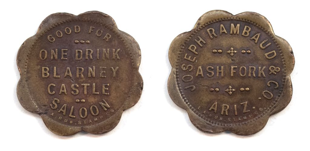 Joseph Rambaud // BLARNEY CASTLE SALOON / Drink Brass scalloped (8). Ash Fork which is a stop along Historic Route 66 which was started in 1882. This is a high quality example of a SALOON TOKEN used from 1909 to 1914 from this historic town.Historic Route 66 Town