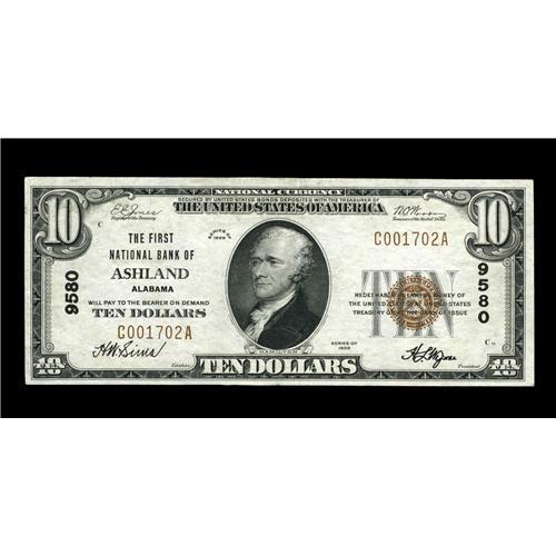 <B>Ashland, AL</B></I> - $10 1929 Ty. 1 <B>The First NB</B></I> Ch. # 9580<BR>This bright and well centered note from the only bank to issue from this Clay County location remains the nicest example we can recall seeing from here. This institution issued only $10 notes in both small and large size. <B>About Uncirculated.</B></I>