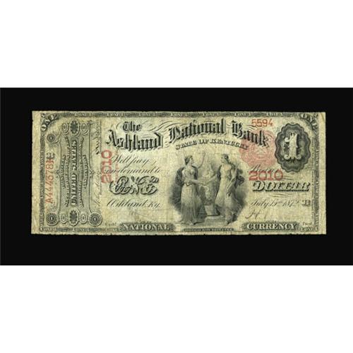 <B>Ashland, KY</B></I> - $1 1875 Fr. 383 <B>The Ashland NB</B></I> Ch. # 2010<BR> This discovery piece is a decent looking ace and one of just a few that have actually made public auction appearances. The paper is as expected for a grade of <B>Good</B></I> and has some minor splitting at the edges and some insignificant pinholes.<BR><BR><b>Shipping:</b> Coins & Currency (<a target="_blank" href="http://www.heritageauctions.com/common/shipping.php">view shipping information</a>)