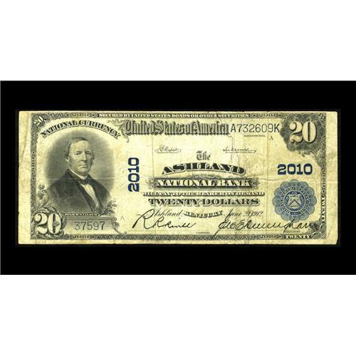 <B>Ashland, KY</B></I> - $20 1902 Plain Back Fr. 654 <B>The Ashland NB</B></I> Ch. # 2010<BR>This piece spent some time folded up in a safe place where it avoided damage and further circulation. <B>Fine.</B></I>