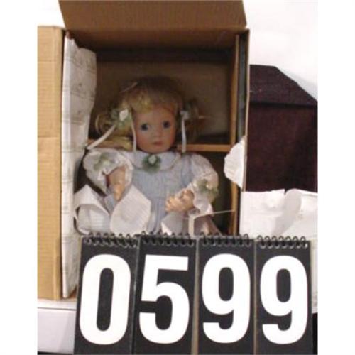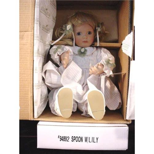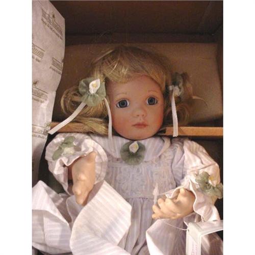 From the renowned Ashton-Drake Galleries, small porcelain doll "A Lily is Innocence" number 94892. Inked on neck is 1878 2A. Doll is created by doll artist Gaby Rademann and is an original issue of the "Language of Flowers" collection, in mint condition. Doll is 8 inches high and box measures 9.5" x 6" x 6.5" and weighs 1 lb 4 oz. [81]