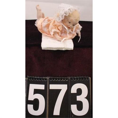 A small porcelain baby doll made by The Ashton-Drake Galleries named Emily # 92040. Doll is in mint condition. Doll is 6 inches long and box measures 9.5" x 4.5" x 4" and weighs 10 ounces. [81]
