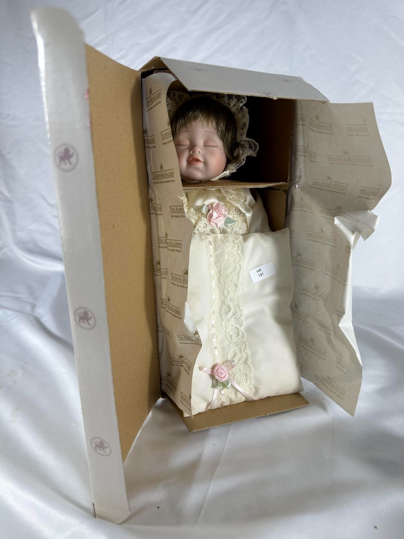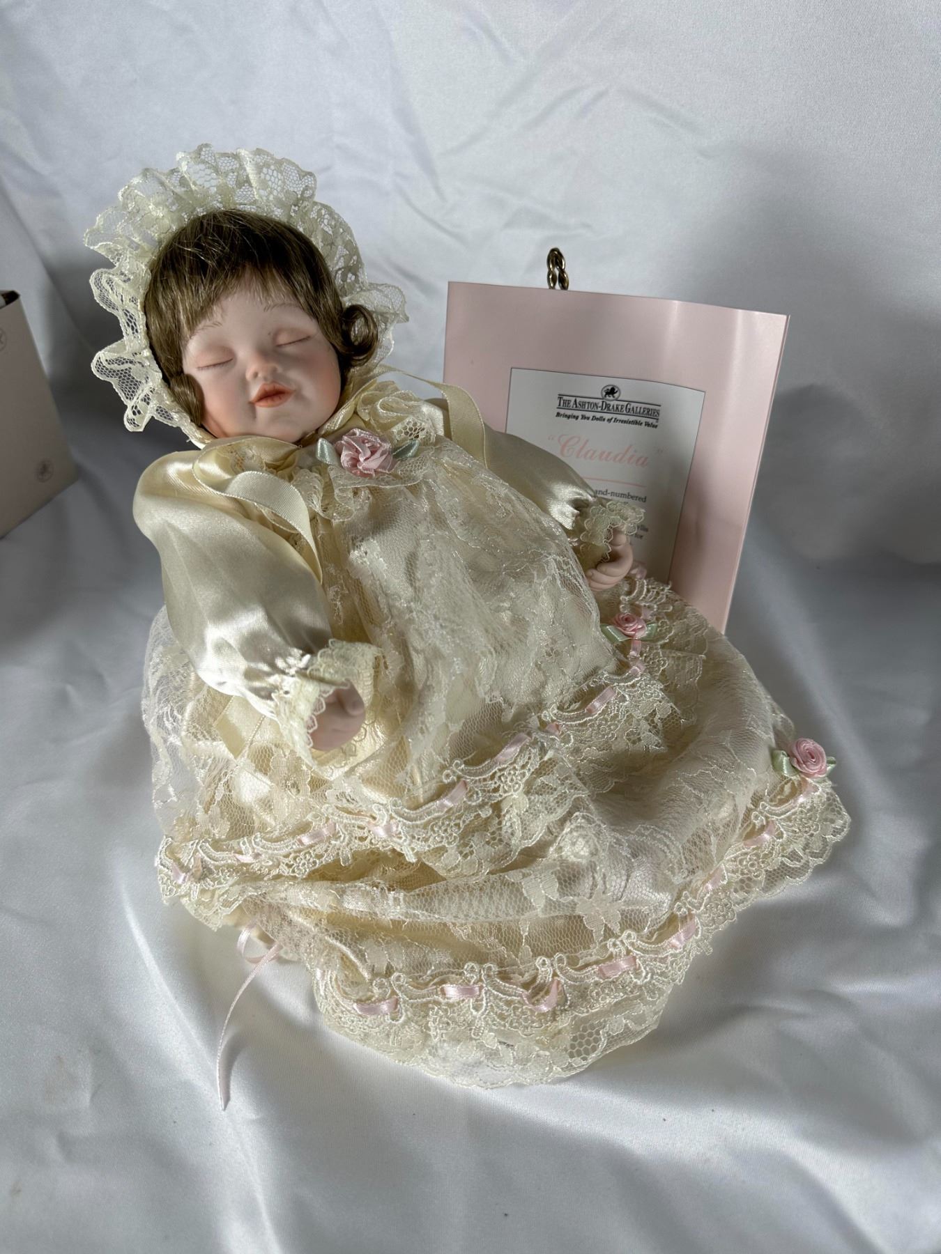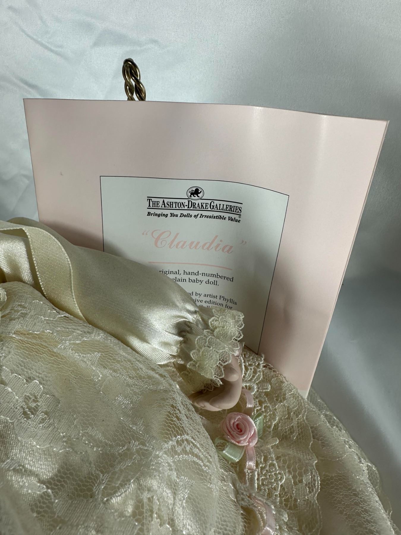Limited-edition porcelain doll by The Ashton-Drake Galleries titled *“Claudia.”* A sleeping baby doll with hand-painted features, dressed in a cream gown with lace overlay, pink ribbon accents, and bonnet. Includes certificate of authenticity and Ashton-Drake documentation.