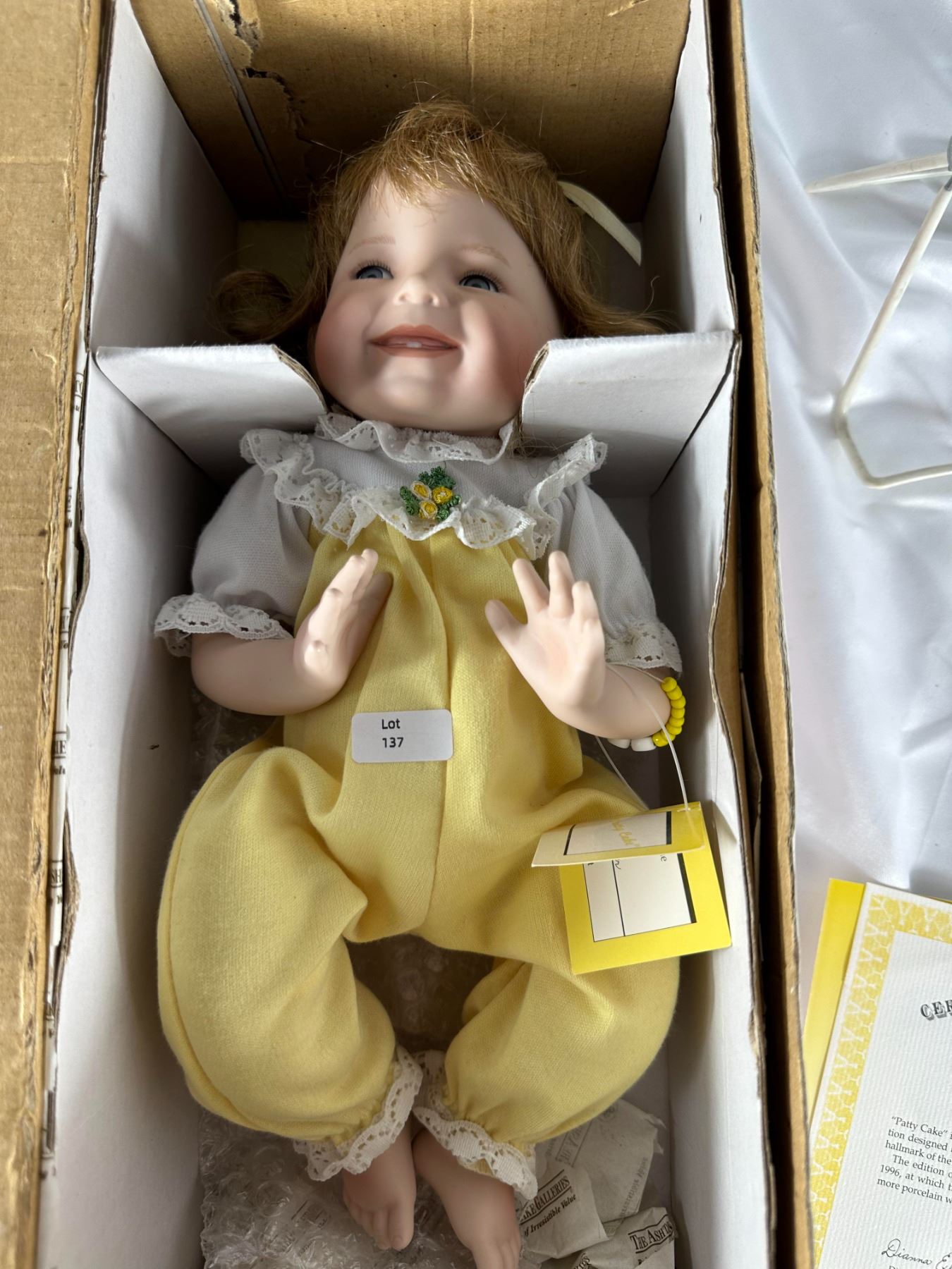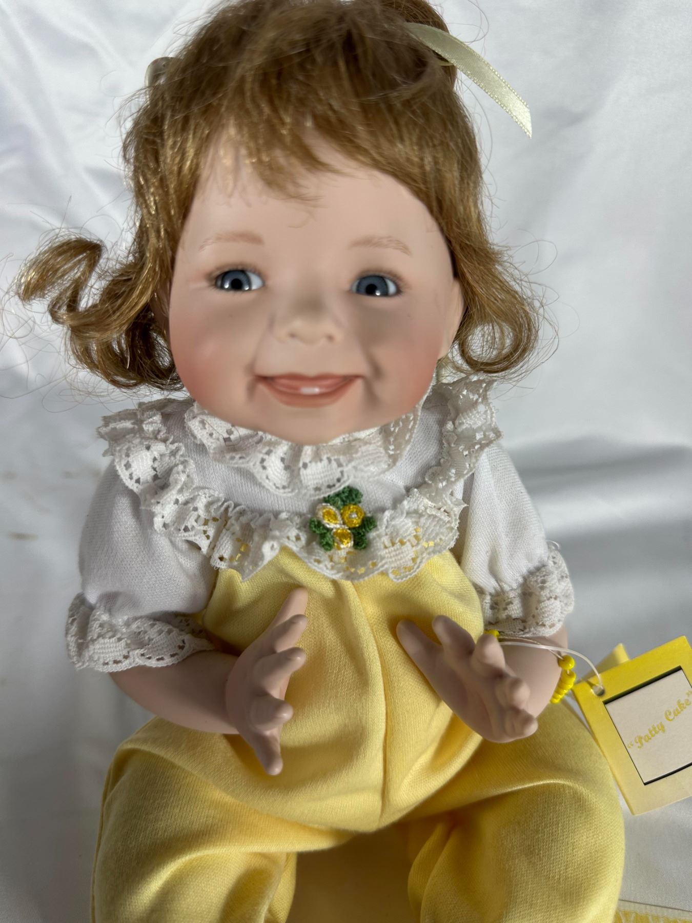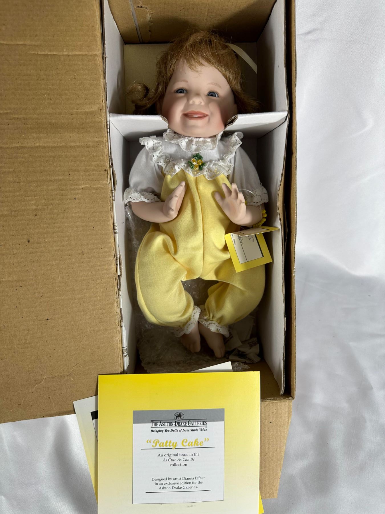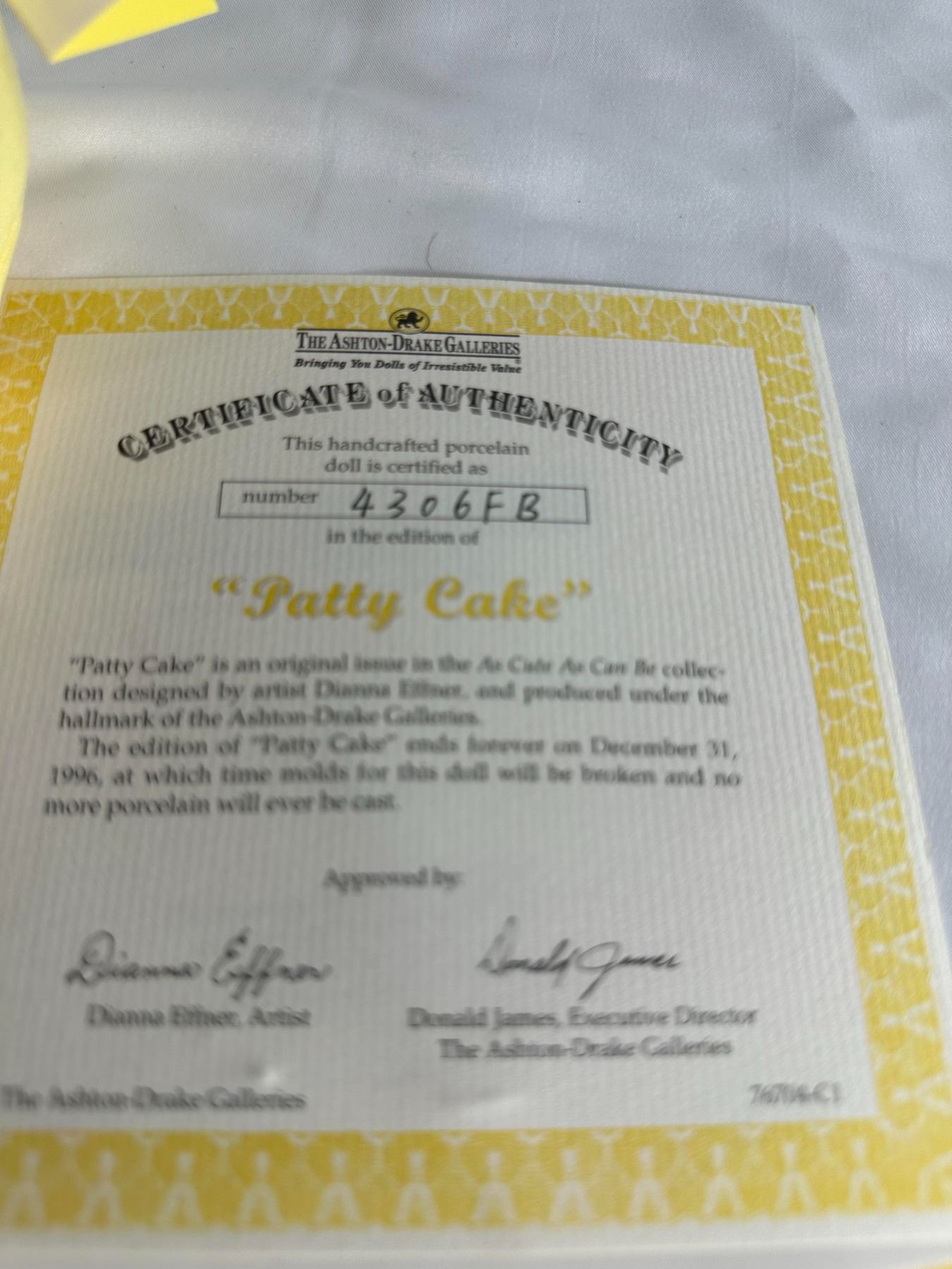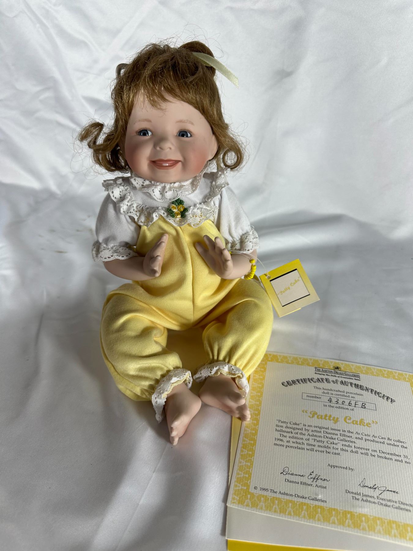 Porcelain doll titled *“Patty Cake,”* designed by Dianna Effner as part of Ashton-Drake’s *As Cute As Can Be* collection (1995). Features hand-painted details, blonde hair, dressed in yellow outfit with lace trim. Includes COA (edition 4306FB).