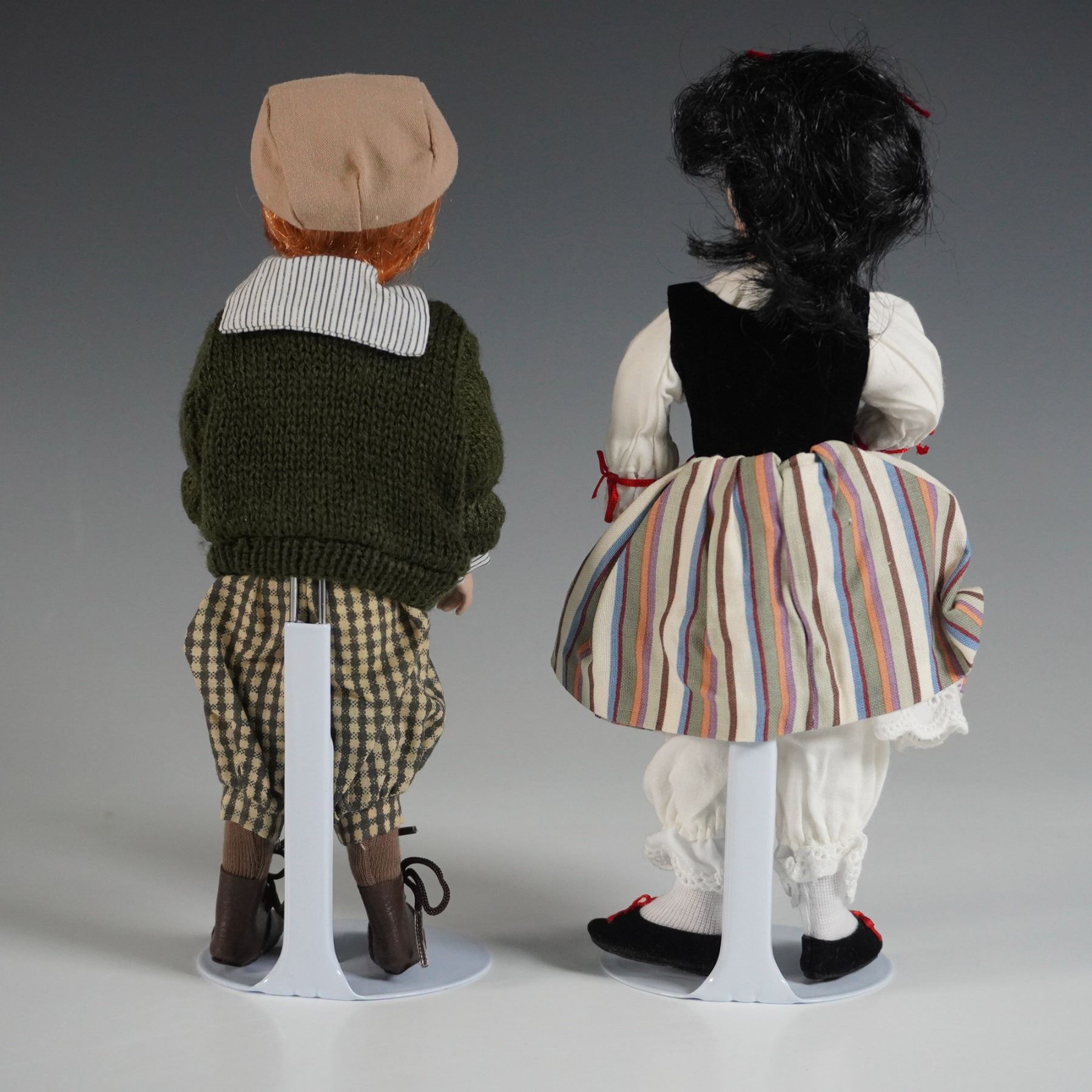 This Ashton-Drake Galleries porcelain doll set features Snow White alongside Snips and Snails, a charming duo dressed in detailed period-style clothing. Snow White wears a traditional European folk dress with a striped skirt, black bodice, and lace-trimmed blouse, accented with red ribbon details. Snips and Snails is dressed in a green knit sweater, checkered trousers, lace-up boots, and a newsboy cap, accompanied by his playful toy frogs. Both dolls stand on round display bases and exhibit finely crafted porcelain faces with delicate hand-painted details. Includes the original Ashton-Drake Galleries box.