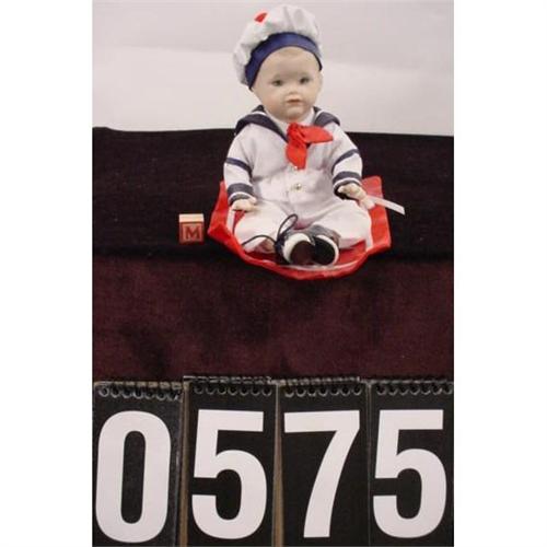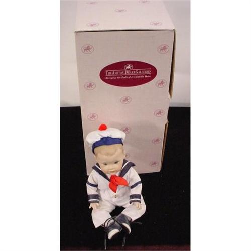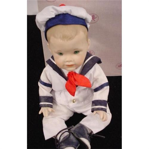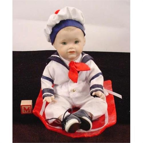 A small porcelain baby doll made by The Ashton-Drake Galleries named Matthew #92039. Doll is in mint condition and was made by doll artist Yolanda Bello. Doll is dressed in little sailor uniform with cap . Doll is 6 inches long and box measures 9.5" x 4.5" x 4" and weighs 10 ounces. [81]