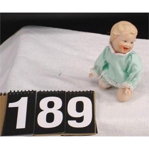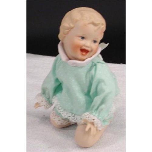 A small porcelain baby made by The Ashton-Drake Galleries. Named "Sarah" # 92035 from artist Yolanda Bello. Doll is in perfect condition and is dressed in green and white pajamas. Doll measures 6 inches long and weighs 4 ounces. [81]