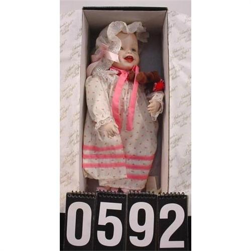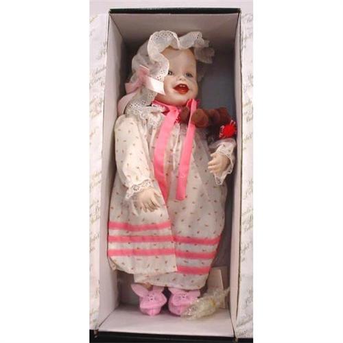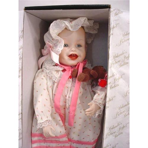 Made by the Edwin M. Knowles China Company and supplied by the Ashton-Drake Galleries is "Sarah" number 76115. Created by doll artist Yolanda Bello from "Yolanda's Picture Perfect Babies." Doll is in perfect condition, marking on back of neck read 83174, and signed by Yolanda Bello. Doll measures 14 inches tall and comes with doll stand. Box measures 16" x 7" x 5.5" and weighs 2 lbs 7 oz. [81]