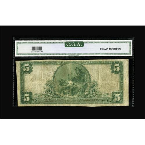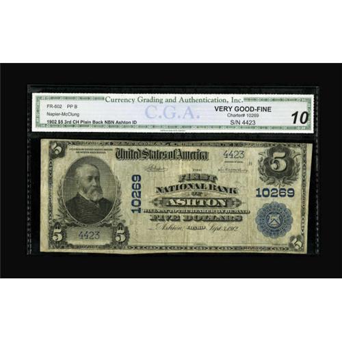 <B>Ashton, ID</B></I> - $5 1902 Plain Back Fr. 602 <B>The First NB</B></I> Ch. # 10269<BR> This moderately circulated issue is one of only four notes known from this remote Idaho town. It is also the only note to be offered publicly since 2001. The paper is solid and the design still bold. <B>CGA Very Good-Fine 10.</B></I><BR><BR><b>Shipping:</b> Coins & Currency (<a target="_blank" href="http://www.heritageauctions.com/common/shipping.php">view shipping information</a>)