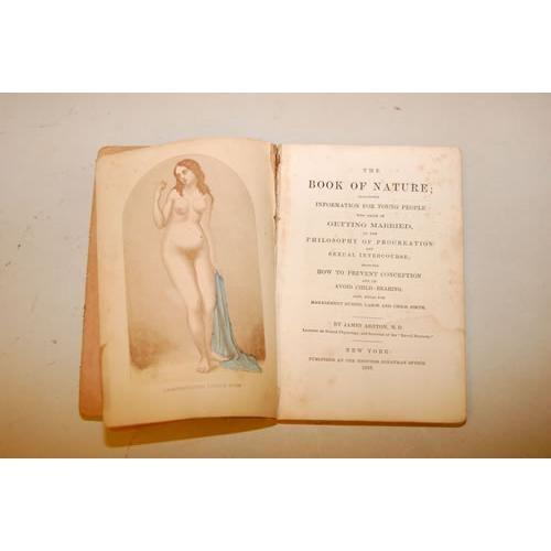 Ashton, James. The Book of Nature; Containing Information For Young People Who Think of Getting Married, on the Philosophy of Procreation and Sexual Intercourse; Showing How to Prevent Conception and to Avoid Child-Bearing. (EARLY BOOK ON SEXUAL INTERCOURSE). New York: Published at the Brother Jonathan Office, 1866. 16mo - over 5¾" - 6¾" tall. Fair to Good Condition. NOT EX-LIBRARY. 64pp bound in stiff, blind stamped cloth. Complete with 9 engraved plates, 8 of which are hand colored, 4 of which are folding ( 2 folding plates of male & female genitalia). Interior foxing with wandering water stain. Front hinge starting, binding tight.