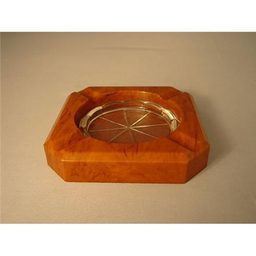 This is a very nice bakelite and glass ashtray.It is French circa 1920. The glass insert is probably not the original, but it fits very well. The quality and condition of both pieces are good.The dark tan colour is quite neutral. It would combine very well with nutwood and black laquered Art-deco furniture!! An original gift for a smoker or bakelite collector!It measures the following: H..75 ins.xW.4.75ins.x D.4.75ins.