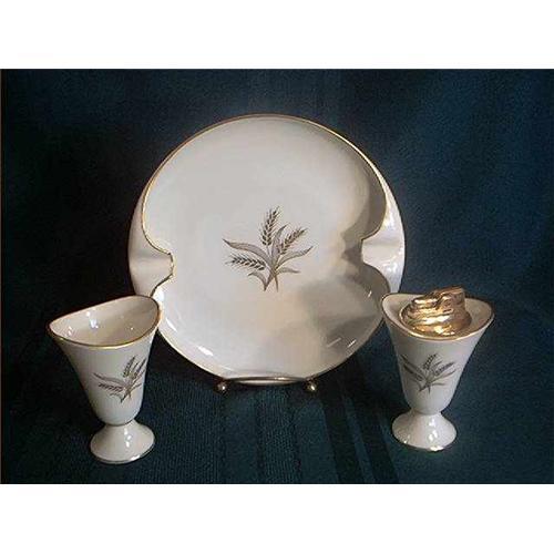 Lenox ashtray with cigarette lighter and cigarette box container. This set by Lenox is a pretty off white or cream color with a wheat design in the center and trimmed in gold. Marked "Lenox Made In The USA. The ashtray is 8 inches wide and the lighter and the holder are 3.5 inches high and all are in excellent condition.