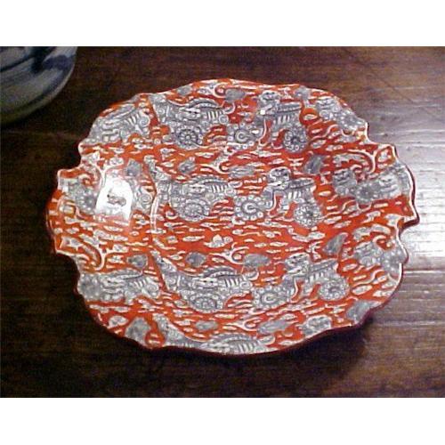 Here we have the very stunning pattern, Bandanna, used by both Ashworth and Mason's. The tray has a bold red ground with foo lions and cloud patterns covering the surface. The edge is trimmed in a deep magenta. The tray has shaped handles and a scalloped edge. It is in excellent condition. It bears the impressed Ashworth mark, and dates to around 1860. The tray measures approximately 10" from handle to handle.