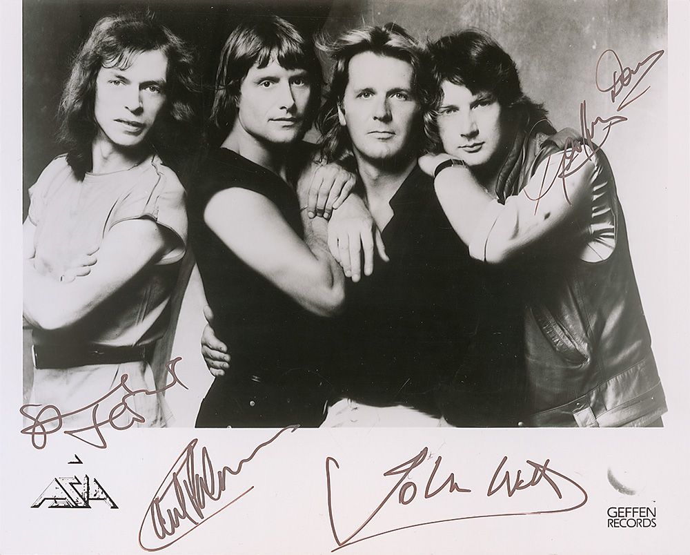 Glossy 10 x 7.75 Geffen Records promotional photo, signed in silver ink by all four original members: John Wetton, Geoff Downes, Steve Howe, and Carl Palmer. In fine condition, with a trimmed top edge. Photo was originally acquired by Bob Roper of WEA Records in Canada.