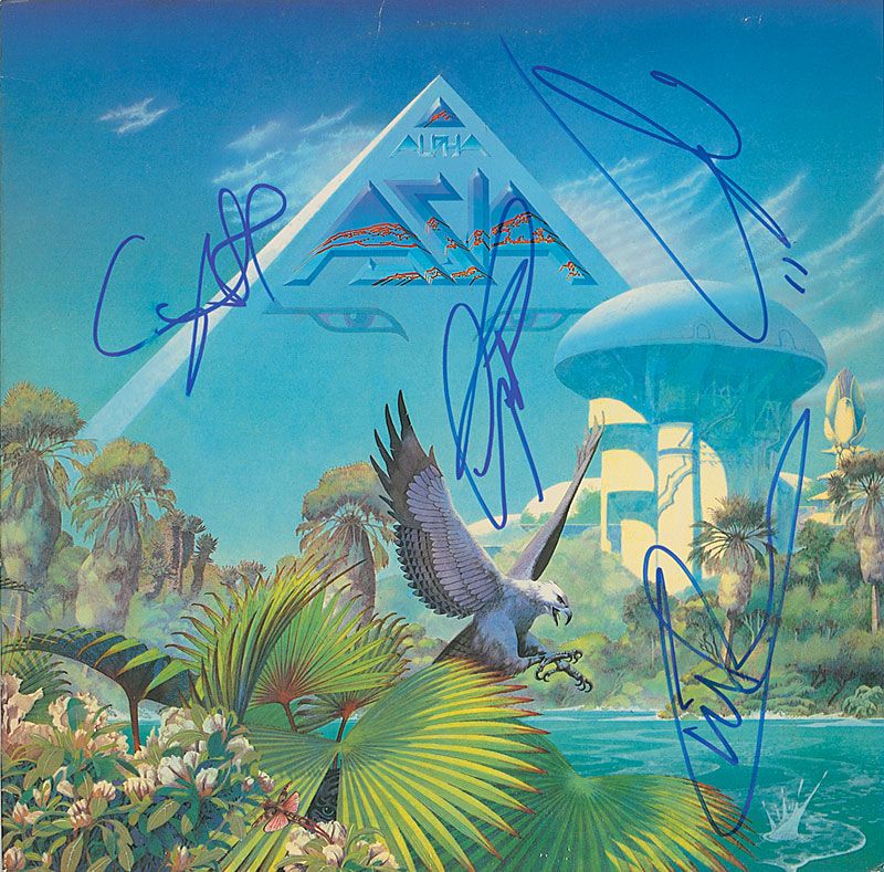 Alpha album signed on the front cover in blue felt tip by John Wetton, Geoff Downes, Steve Howe, and Carl Palmer. In fine condition, with a couple light creases. The record is included.
