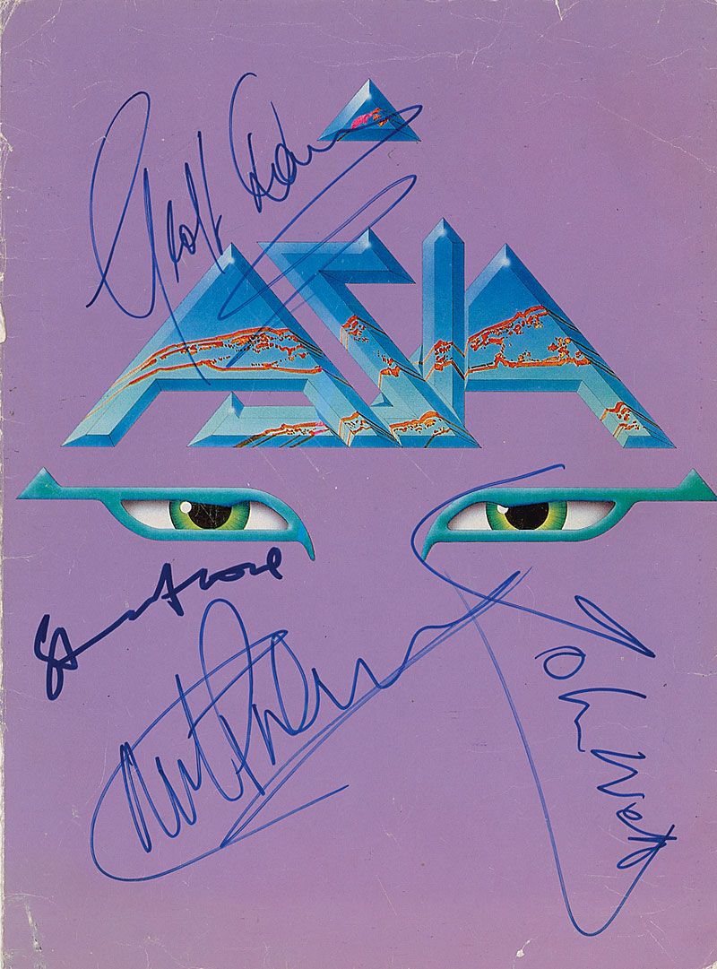 Purple program cover featuring Asia’s logo, 9.5 x 13, signed in person in blue felt tip by John Wetton, Geoff Downes, Steve Howe, and Carl Palmer. In very good condition, with moderate scattered creases and a few small edge tears.