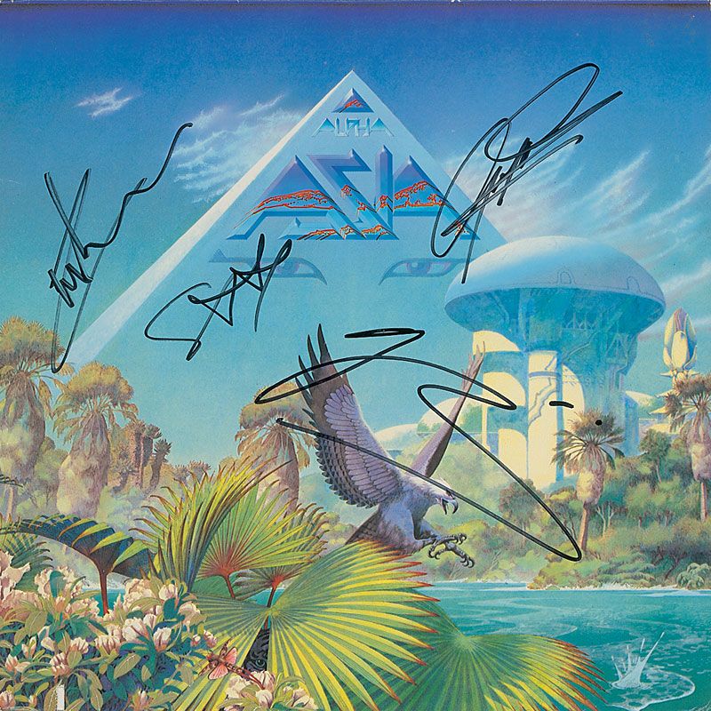 Alpha album signed on the front cover in black felt tip by John Wetton, Geoff Downes, Steve Howe, and Carl Palmer. In fine condition, with a couple of light creases and a discount cut to bottom edge. The record is included.