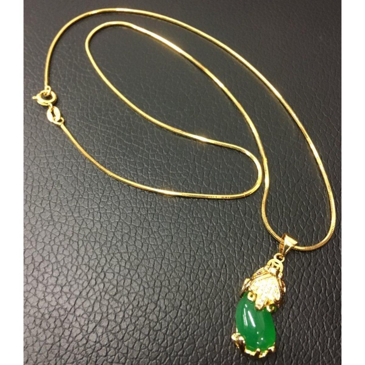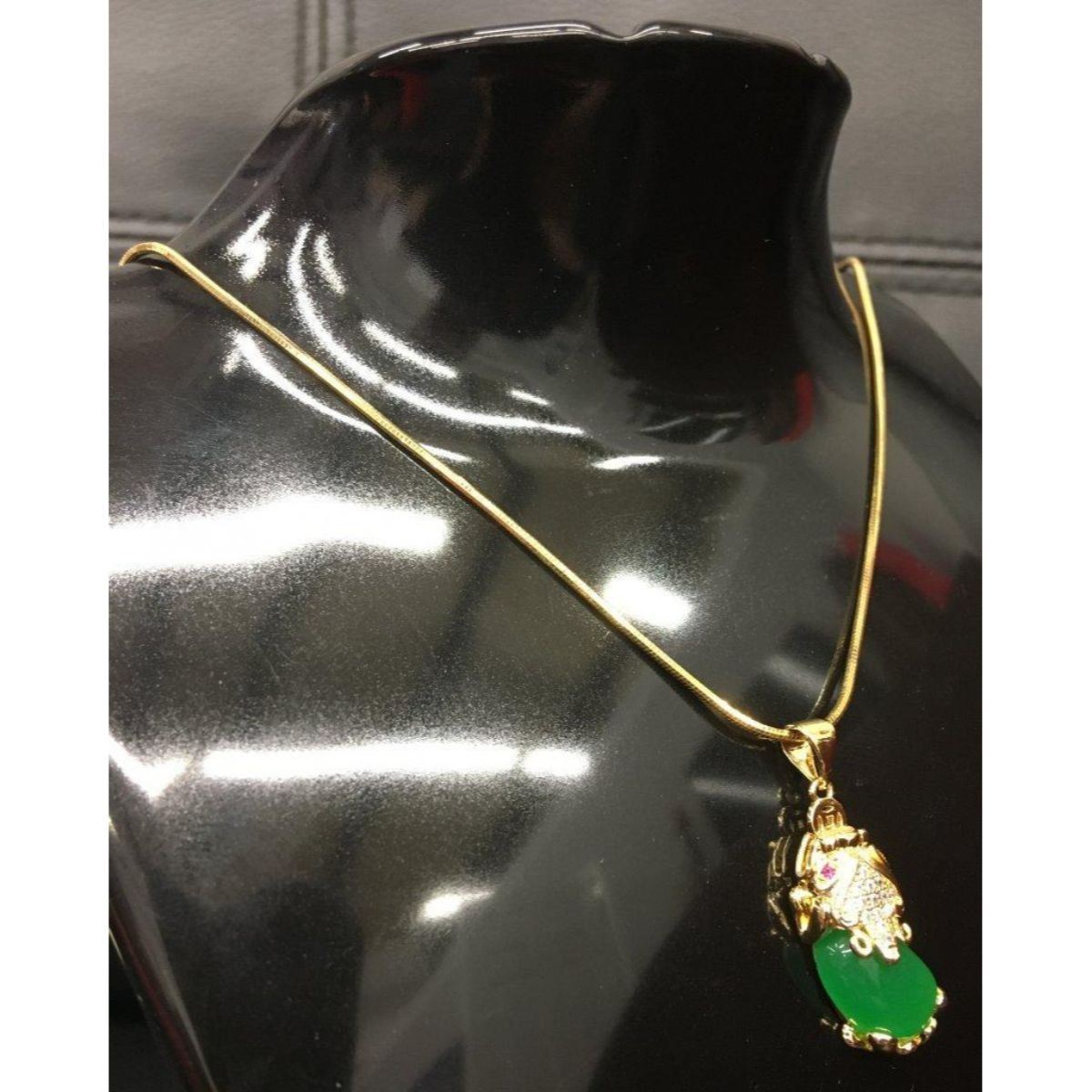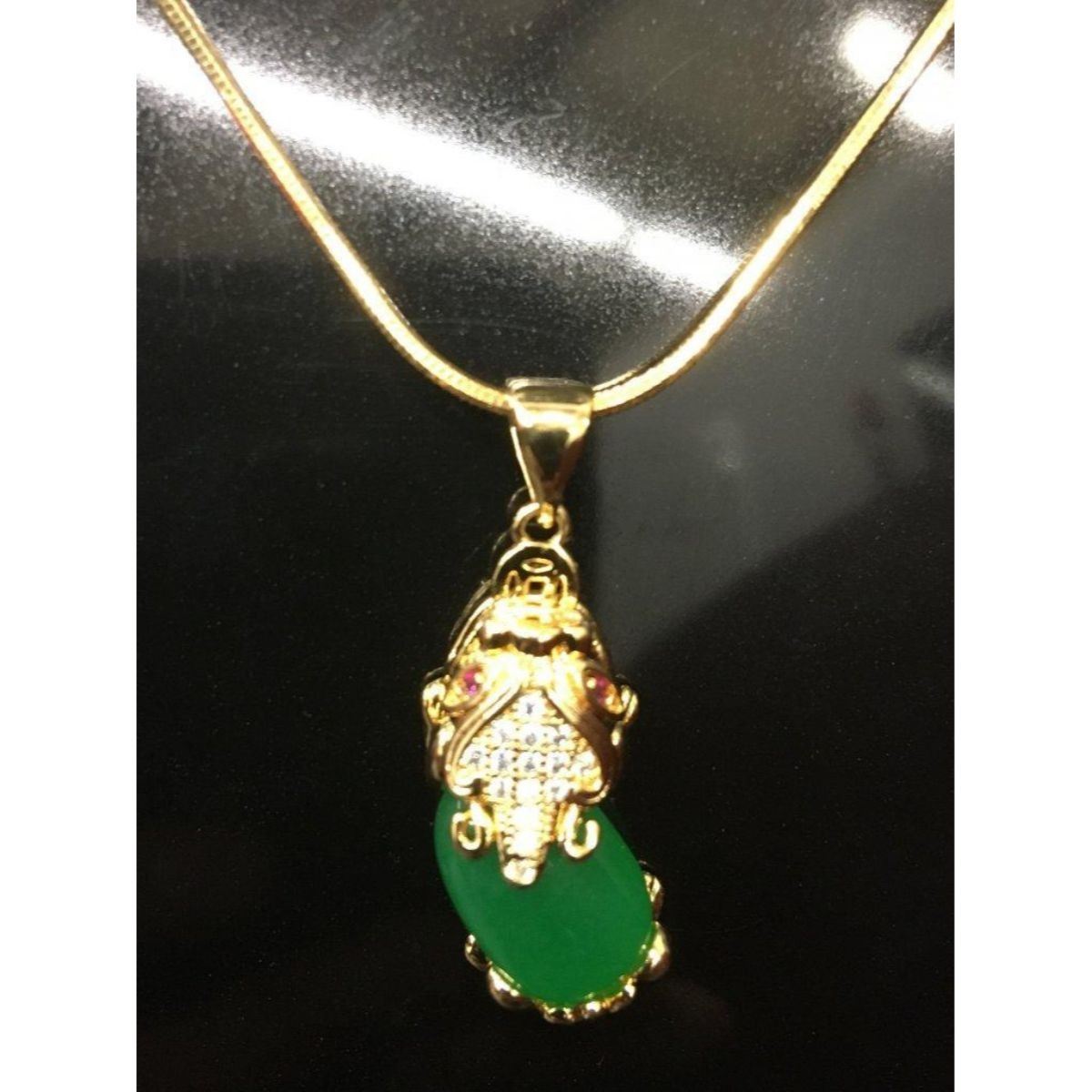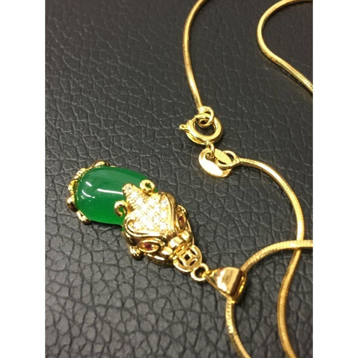 Asian Carved Green Jade Foo Dog Pendant On Chain. The Foo Dog Pendant Has Stones on The Top Of The Main And In The Eyes. View Photos For Further Details.