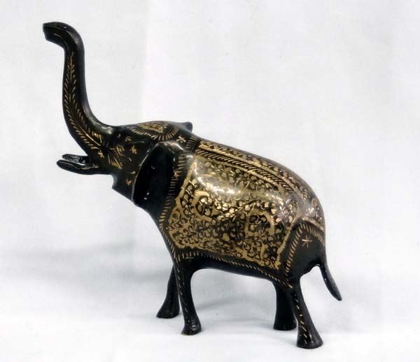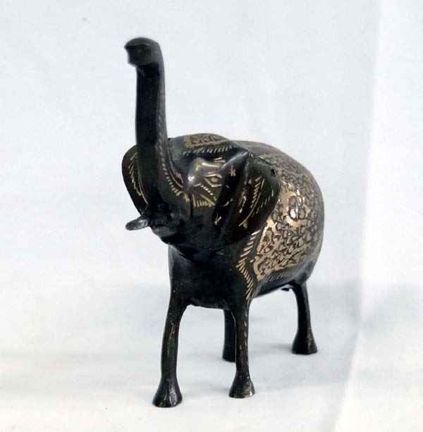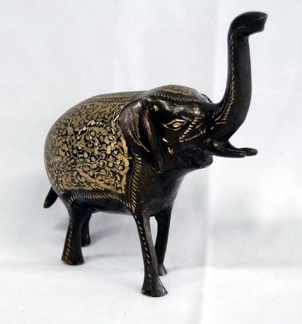Asian Cast Hand Crafted Metal Elephant with Diamond Cut Designs. Stunning designs adorn this raised trunk elephant. This piece is approx. 4.75'' long and stands 5'' tall.