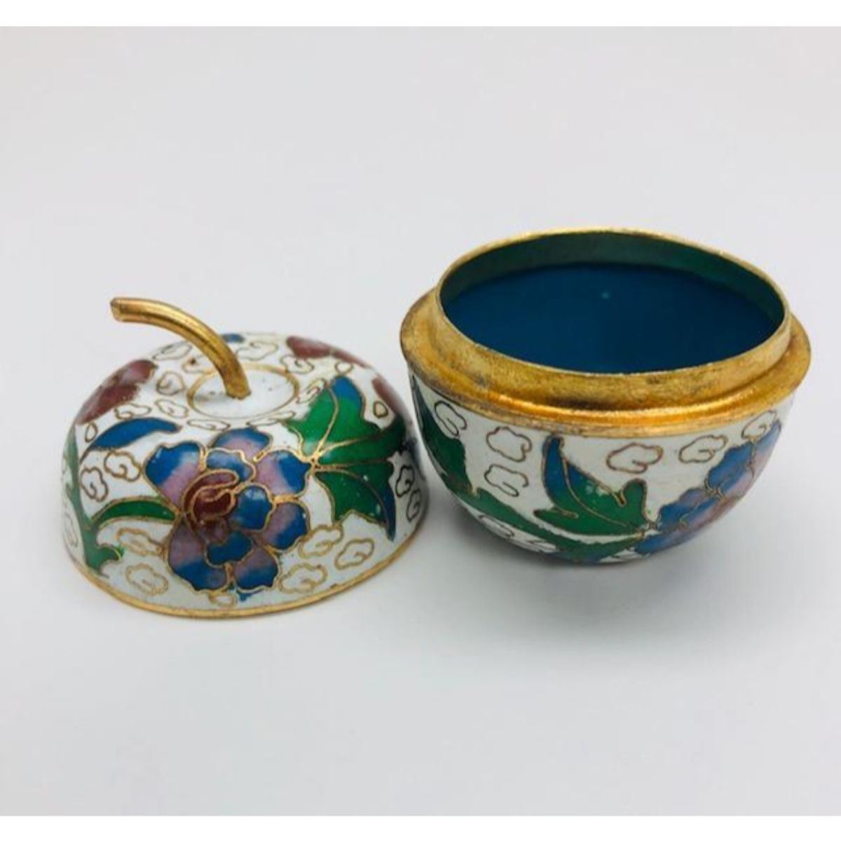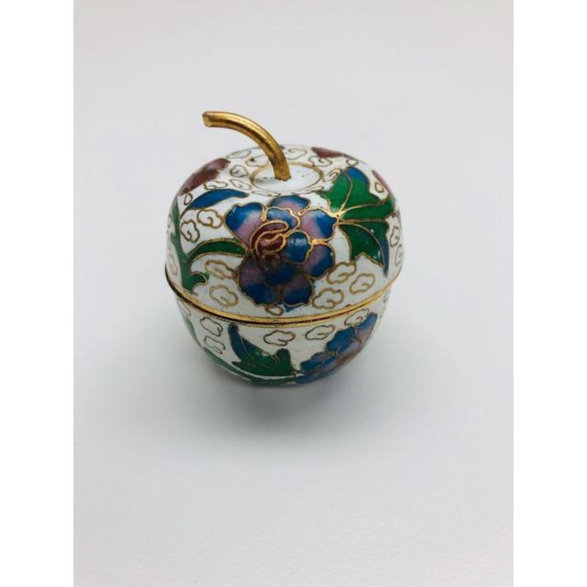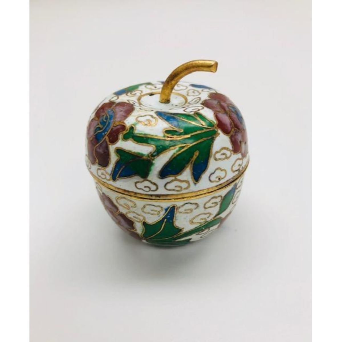 An Asian Cloisonne & Enameled Floral Decorated Apple with Lid. A Design That Is Inspired From The Story Of Adam & Eve. White Red & Green Coloring Makes A Bold Statement & Catches The Eye Of People In THe Room. View Photos For Further Details.