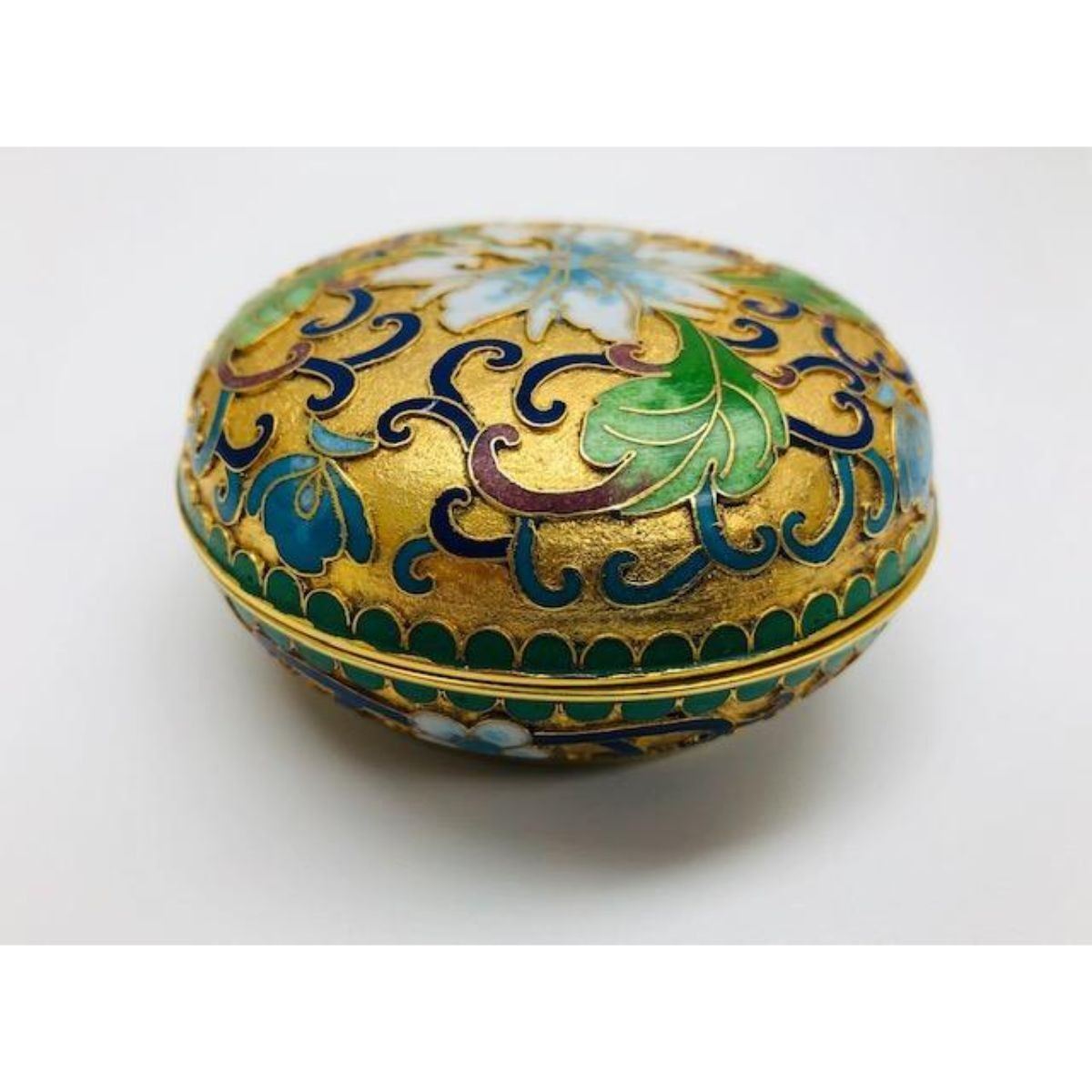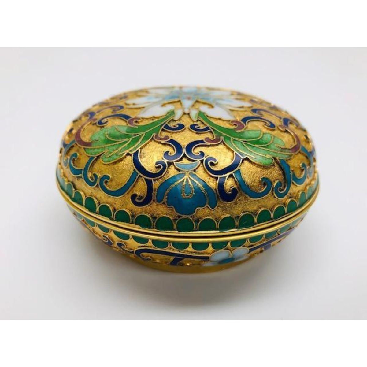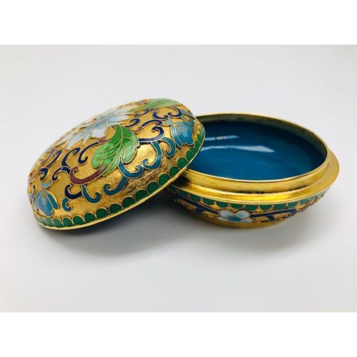 An Asian Cloisonne & Enameled Floral Lidded Comport. With The Lid Resembling The Same Flattened Shape As The Base, The Comports Design Can Be Best Appreciated From An Aerial View. The Piece Offers Clever Colour Contrasts In Gold Red & Green. Simply A Great Collector Piece. View Photos For Further Details.