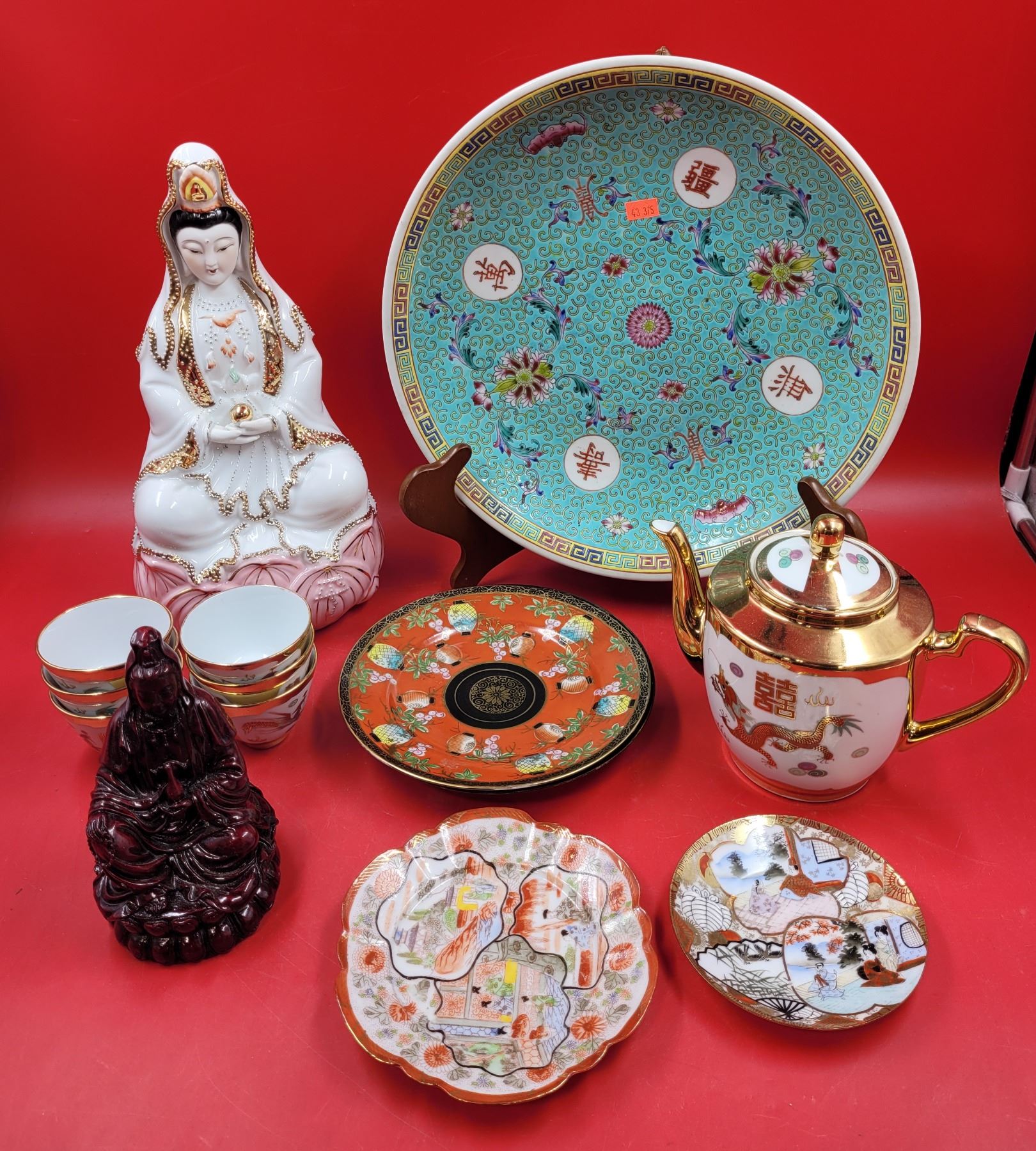 Asian Dish & Decor Lot w/ Teapot, Saucers, Teacups, Figurines, & More