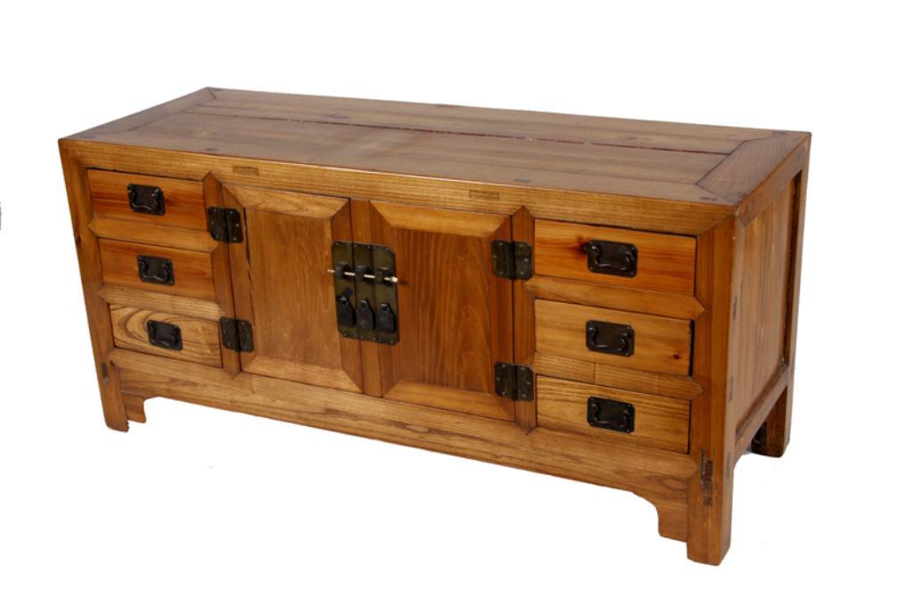 Asian Elm Sideboard Cabinet Measures 23"x48"x17", a square cornered cabinet with miter joints, three small drawers down the side, and one set of doors in the center. The drawers have metal handles and the doors have plain pulls. In overall fair conditionMeasures 23"x48"x17", a square cornered cabinet with miter joints, three small drawers down the side, and one set of doors in the center. The drawers have metal handles and the doors have plain pulls. In overall fair condition with largecrack down the center of the top.