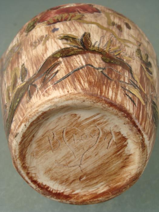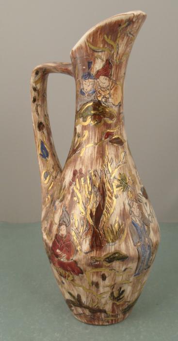 This is a ewer, hand etched and painted with Asian or Arabian figures and landscape. It is marked on the bottom, and we believe this vase is Chinese, dating back over 40 years. It measures 13 1/4" high, and 6 1/2" wide. Its condition is very good, with no chips or cracks. The brown glaze has a natural worn appearance.