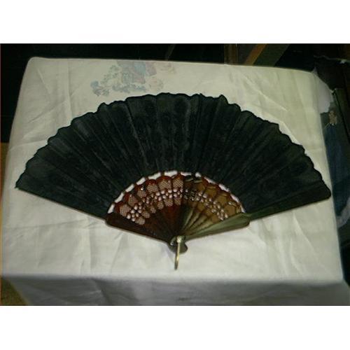 Black sun flower designed pattern silk or nylon, with sun flowers designed all thru it, with either Bakelite handle or plastic, color is very pretty and has a golden ring when closed. As the photos show, it is in really nice condition, has been used, but still looks and works great. No rips anywhere. Hope you like it. Do not know much about Asian fans, so I maybe off on my price, as it came from a great estate, and did not do any home work on it. PRICED LOWERED TO SELL.