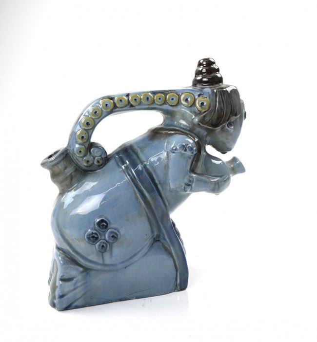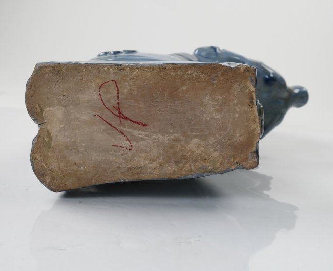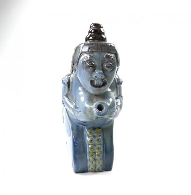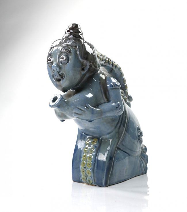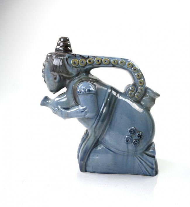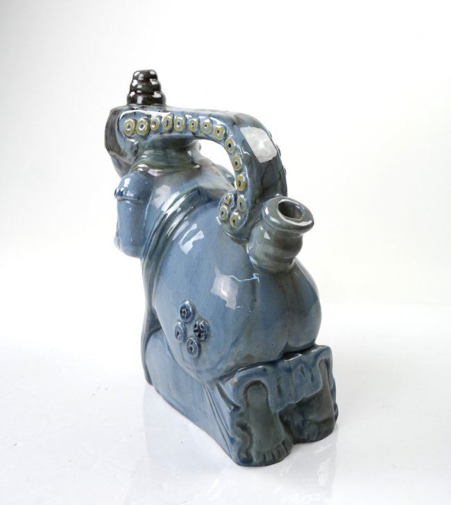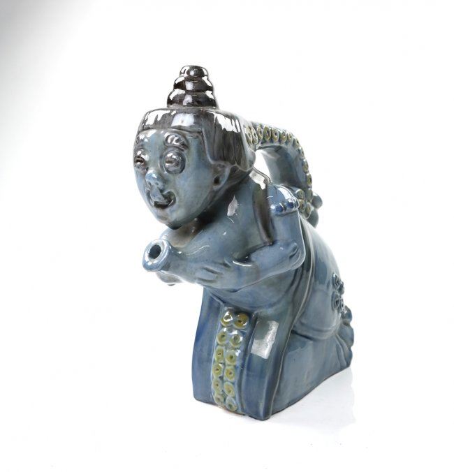 Figural blue glazed pot in the form of a woman, with octopus tentacle handle. 20th century. [9" W x 3 1/2" D x 10" H]. In good condition.