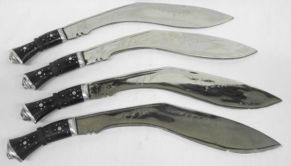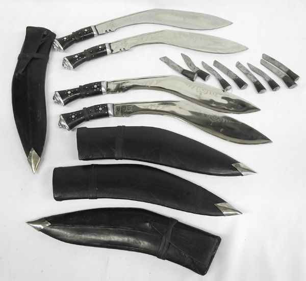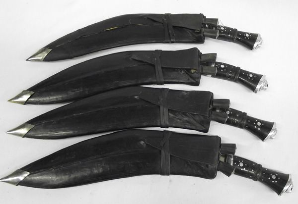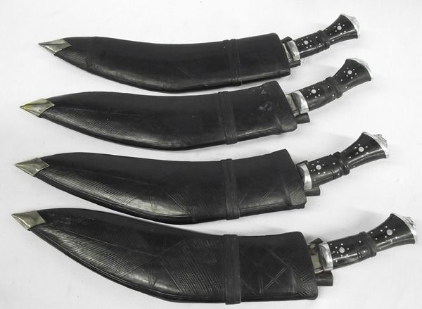 4 Asian Knives (from India) With Leather Sheaths. A set of matching decorative knives, each in black leather sheath with two small throwing knives. They measure 16.5''L.