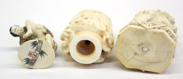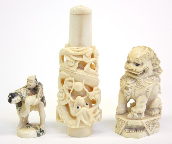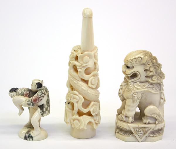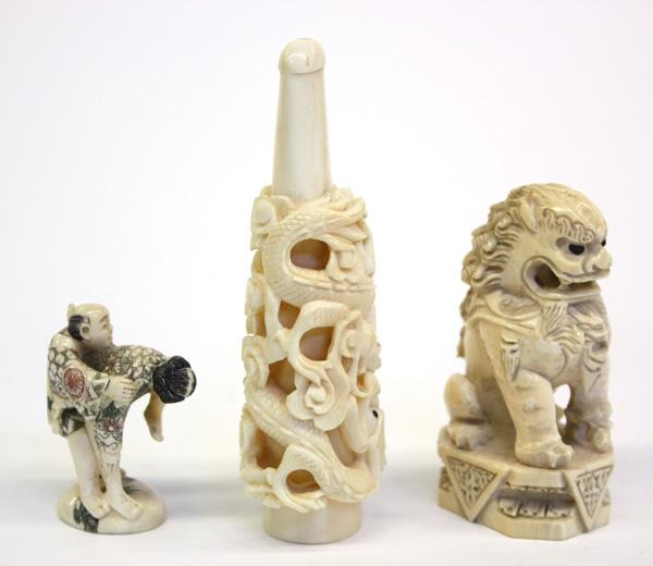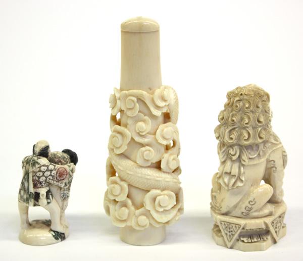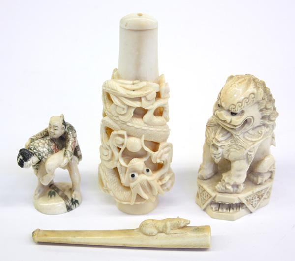 (lot of 4) Asian ivory carvings, consisting of a fu-lion in stance on a shaped plinth, a pigment decorated figural group, and two tapering ornaments one accented by a writhing dragon and the other a mouse, largest: 4.5''h