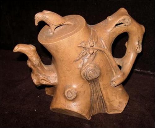 Asian Pottery Tea Pot, Bird on Tree, 7 x 8.