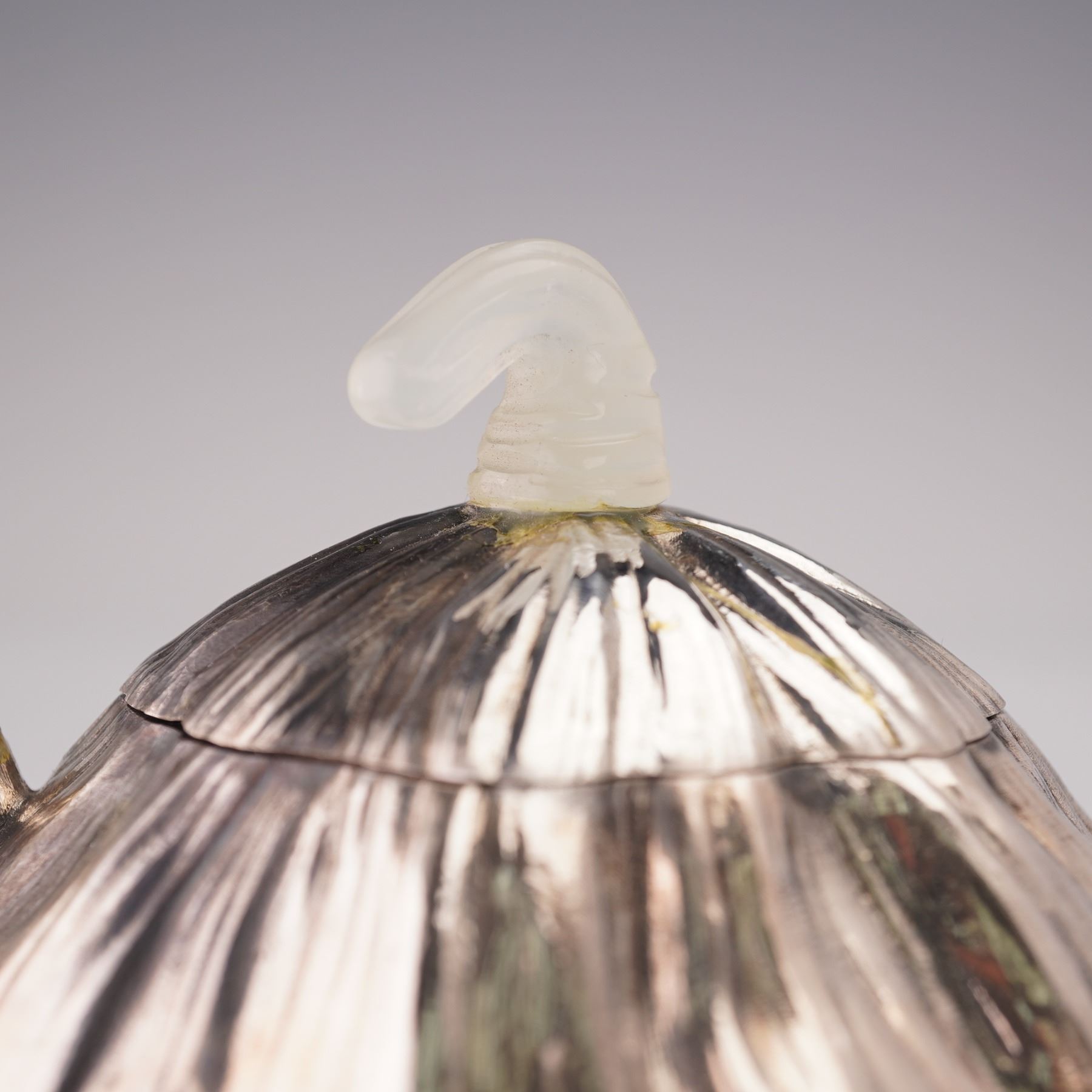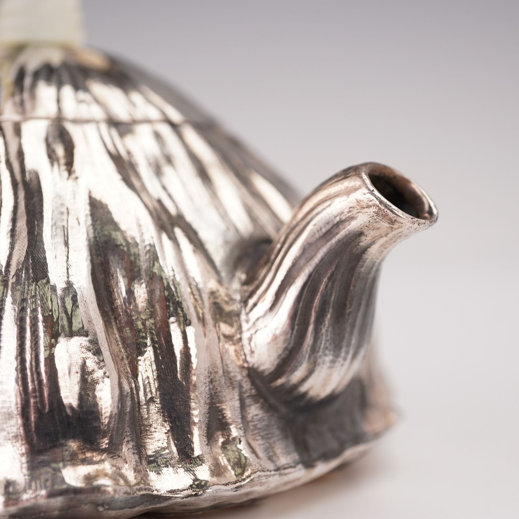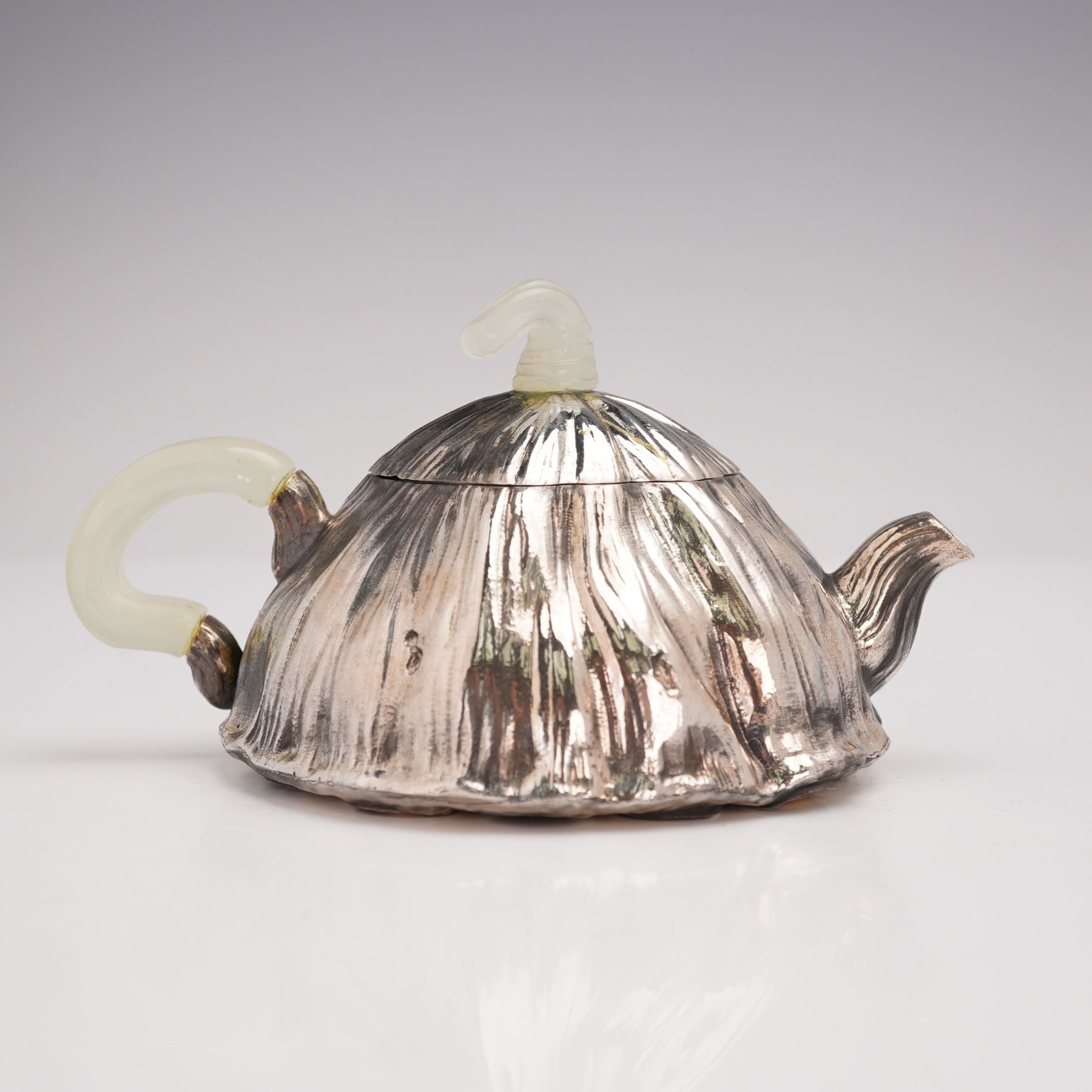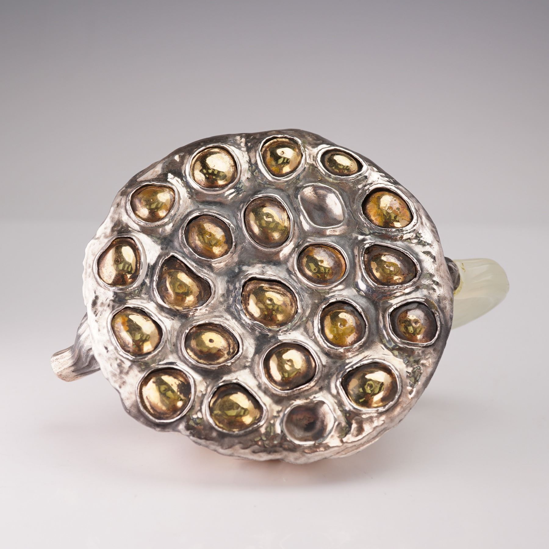 Finely crafted Asian silver teapot inspired by a natural lotus pod, the surface hand-hammered and chased with organic ribbed texture and gilt seeds visible within recessed cavities at the base. The lid fitted with a curved hardstone finial and the handle carved from translucent pale green stone, likely jade or serpentine. The design reflects the sculptural naturalism of late Meiji and early Republic period metalwork, blending Japanese and Chinese stylistic influence. A striking modern interpretation of the lotus motif, symbolizing fertility, purity, and renewal in Asian art. Gross Weight: 10.8 oz.